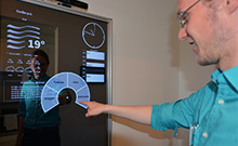 KogniHome-Bewohner sehen im intelligenten Spiegel nicht nur ihr Spiegelbild, sondern auch Informationen zum Wetter und zu ihrem Terminkalender, wie hier Entwickler Alexander Neumann. Foto: Universität Bielefeld