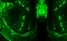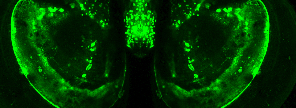 Die zweischalige Muschel leuchtet in hellgrün, weil sie mit einem glimmenden Farbstoff namens Calcein gefärbt ist. Foto: S. Dupont