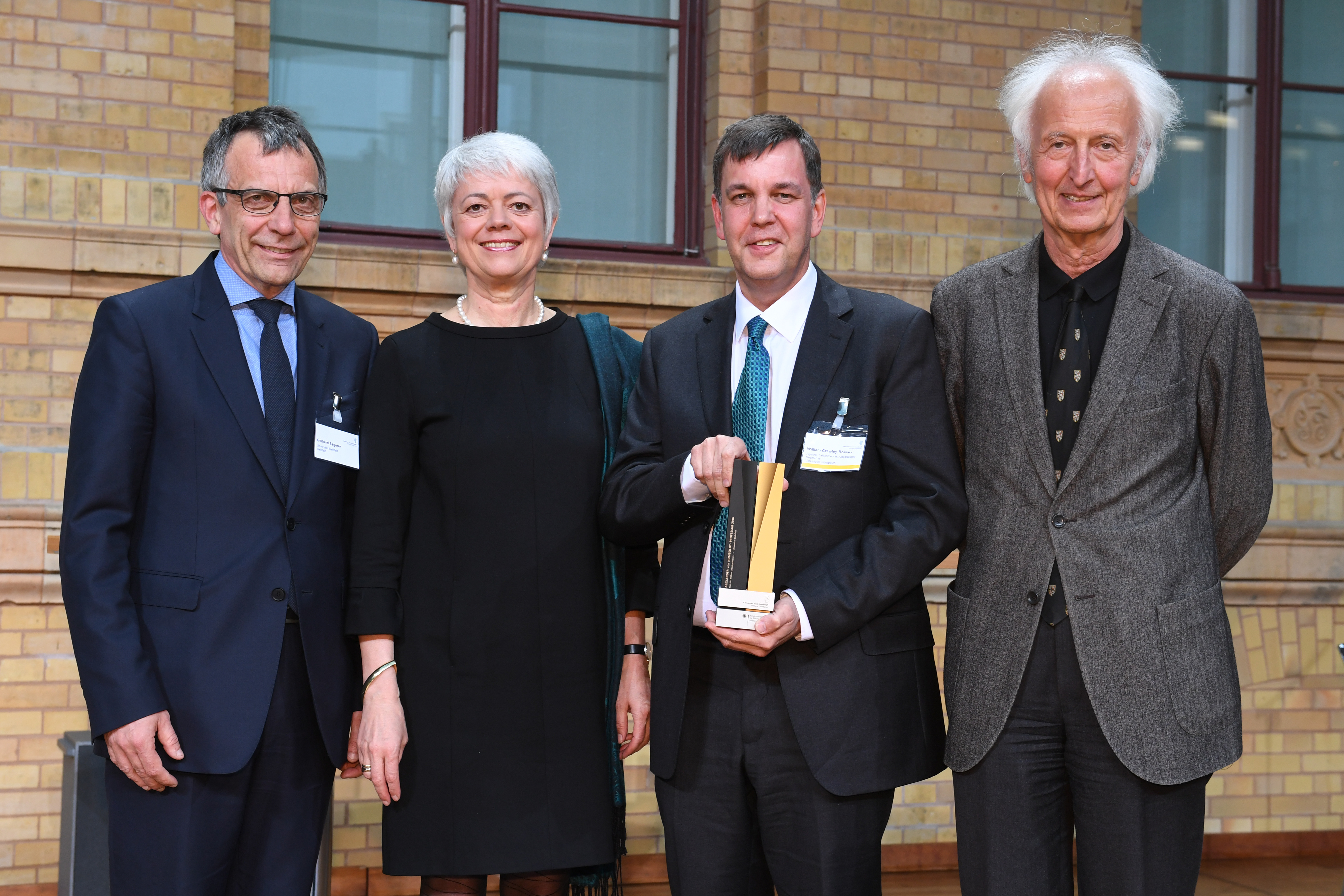 Bei der Verleihung der Alexander von Humboldt-Professur in Berlin: Rektor der Universität Bielefeld, Professor Dr. Gerhard Sagerer, Staatssekretärin im Bundesministerium für Bildung und Forschung, Cornelia Quennet-Thielen, Preisträger Professor Dr. William Crawley-Boevey und Präsident der Humboldt-Stiftung Helmut Schwarz (v.l) Foto: Humboldt-Stiftung/David Ausserhofer