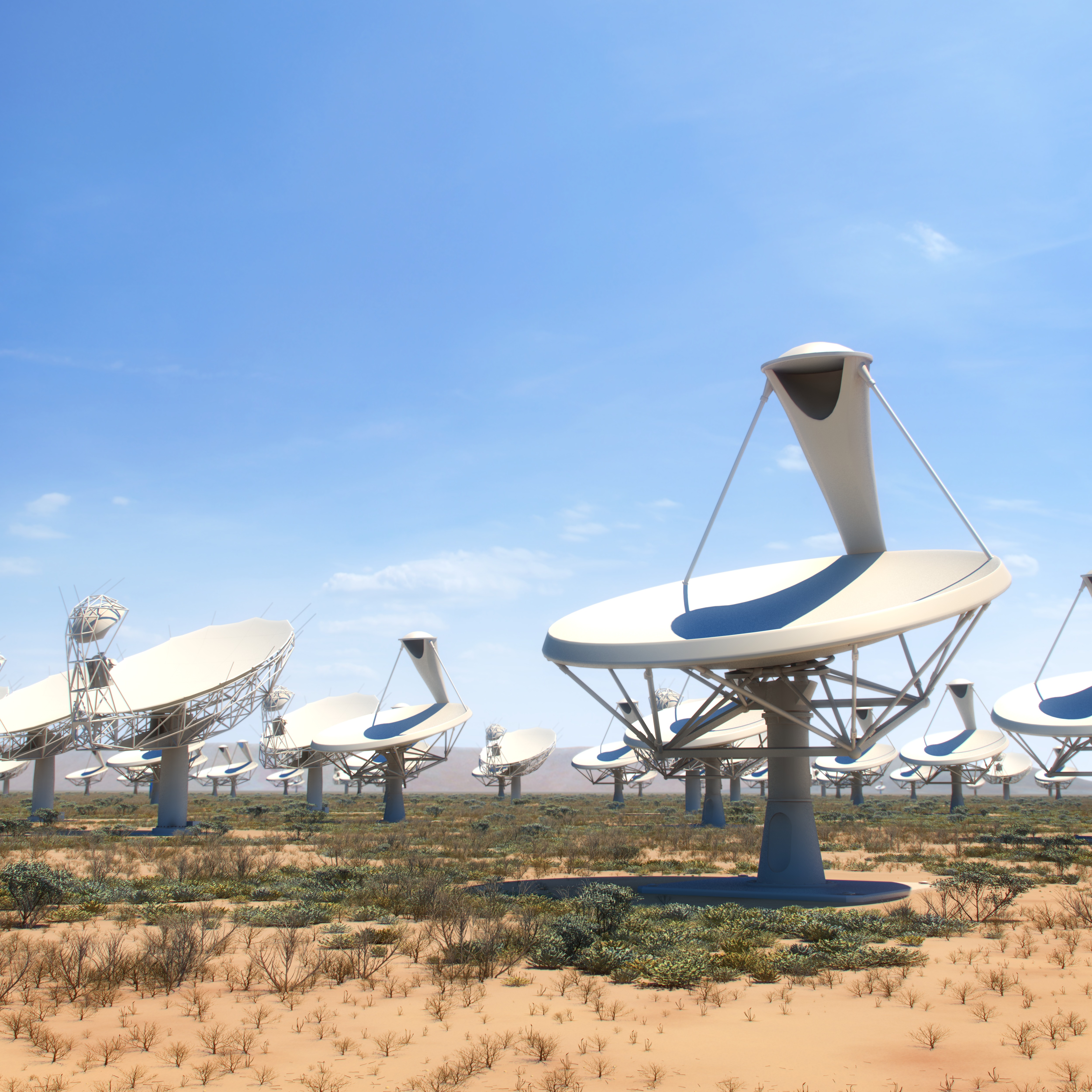 Die Empfangsantennen des SKA-Teleskops sollen in der ersten Ausbauphase ab 2023 über eine Lichtsammelfläche von etwa 15 Fußballfeldern verfügen. Ihre Messungen sollen verstehen helfen, was Dunkle Energie ausmacht. Simulation: SKA-Organisation