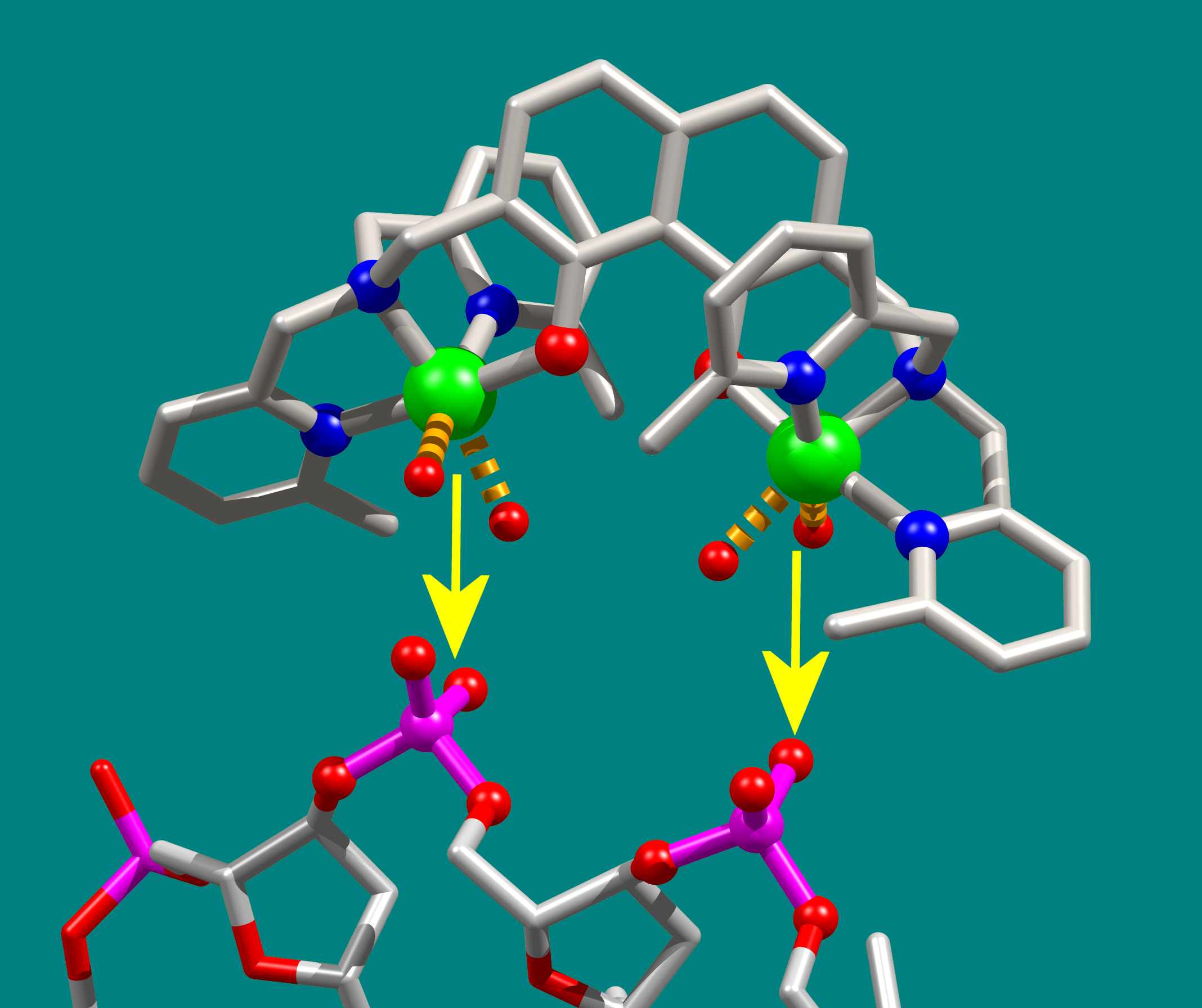 Der neue kupferhaltige Wirkstoff (oben) „klinkt“ sich passgenau in das DNA-Molekül (unten) einer Krebszelle ein und beendet ihr Wachstum. Die Folge: Die Krebszelle stirbt.