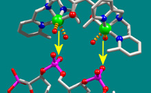 Bild: Der neue kupferhaltige Wirkstoff (oben) „klinkt“ sich passgenau in das DNA-Molekül (unten) einer Krebszelle ein und beendet ihr Wachstum. Die Folge: Die Krebszelle stirbt.Bildnummer: 98120