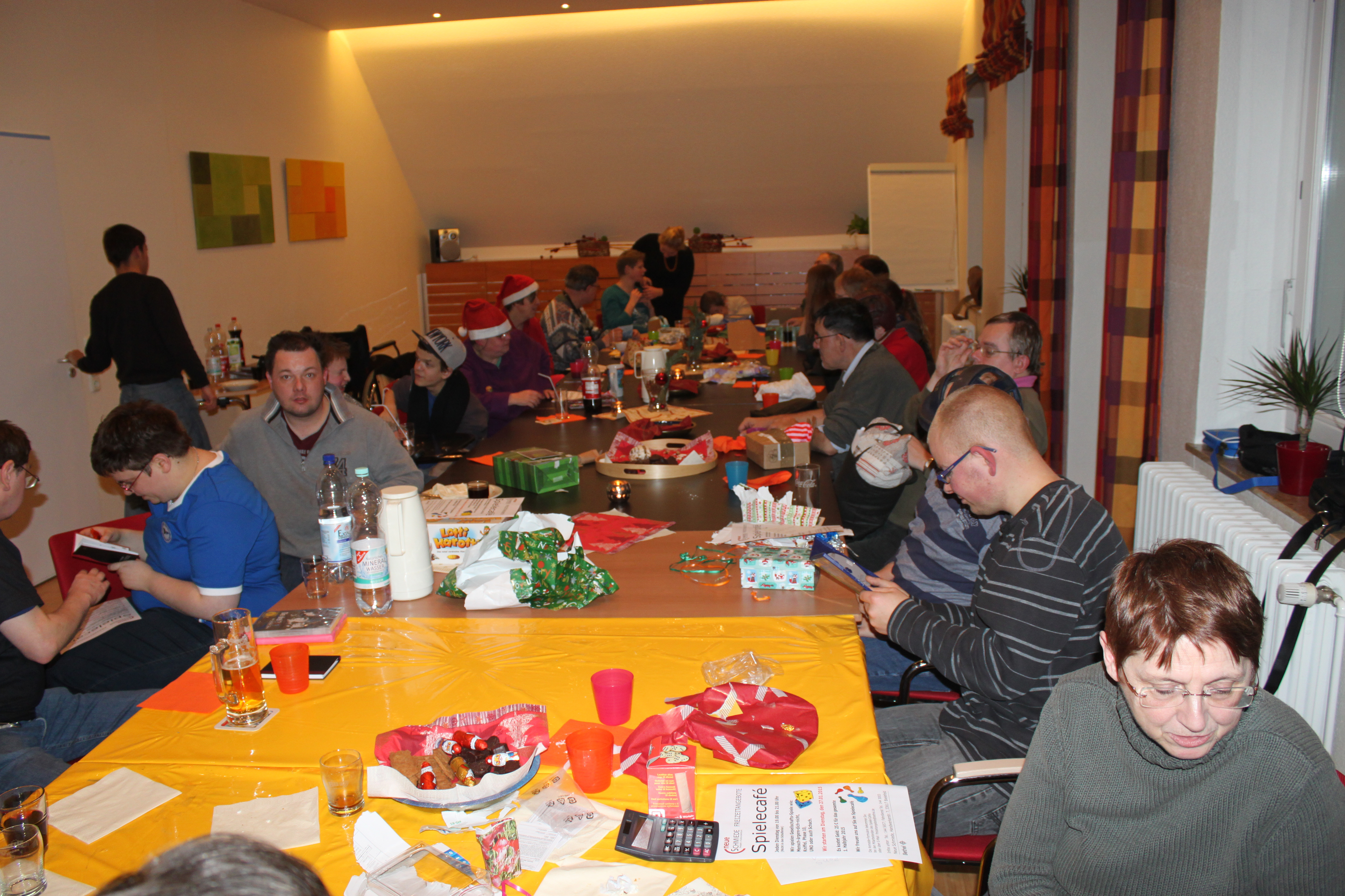 Weihnachtsfeier mit traditionellem Wunschbaum-Päckchen-Auspacken im Spielecafé.