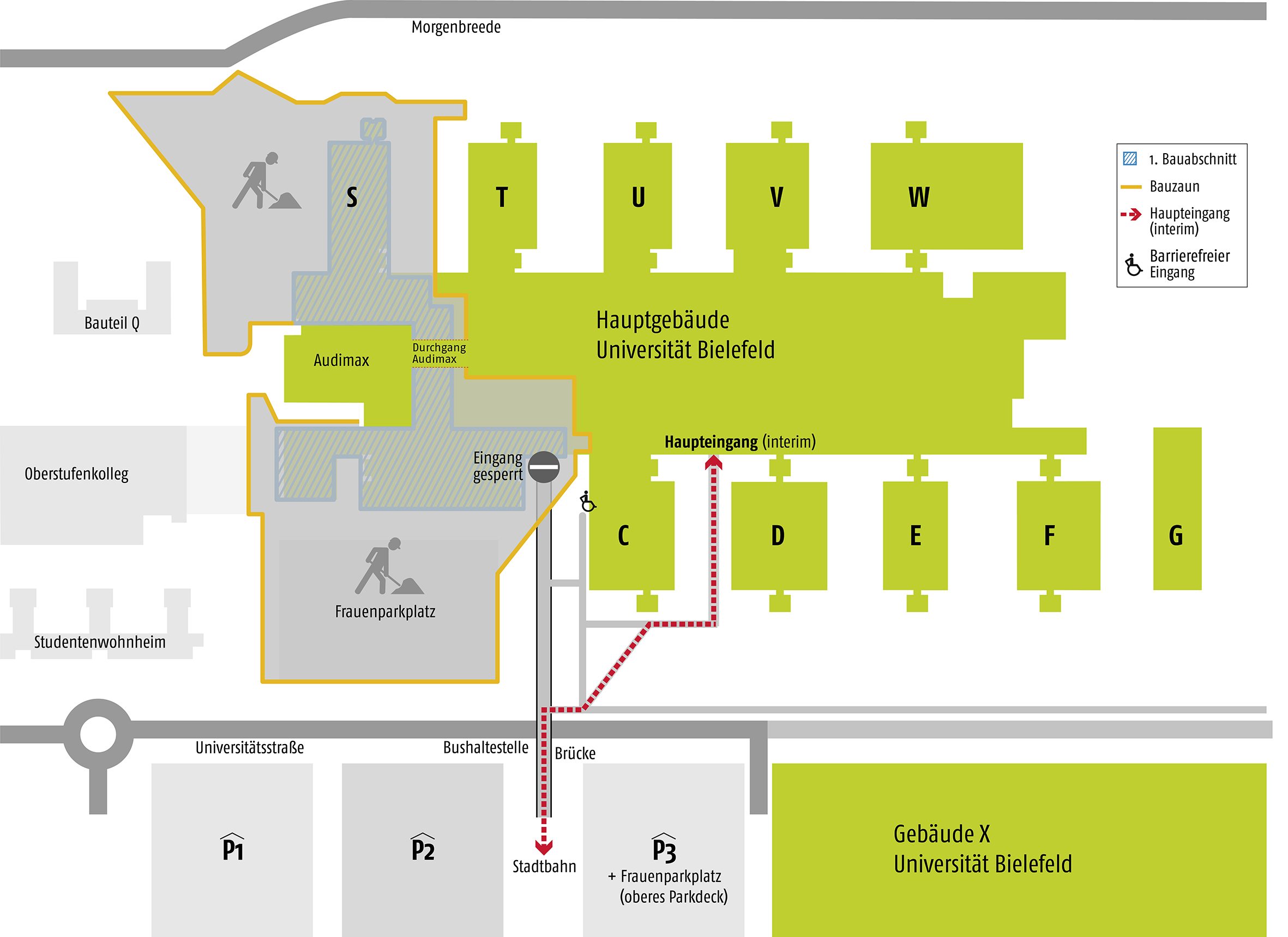 Die Karte zeigt den neuen Weg zum Haupteingang (interim) und die Parkplatzalternativen.