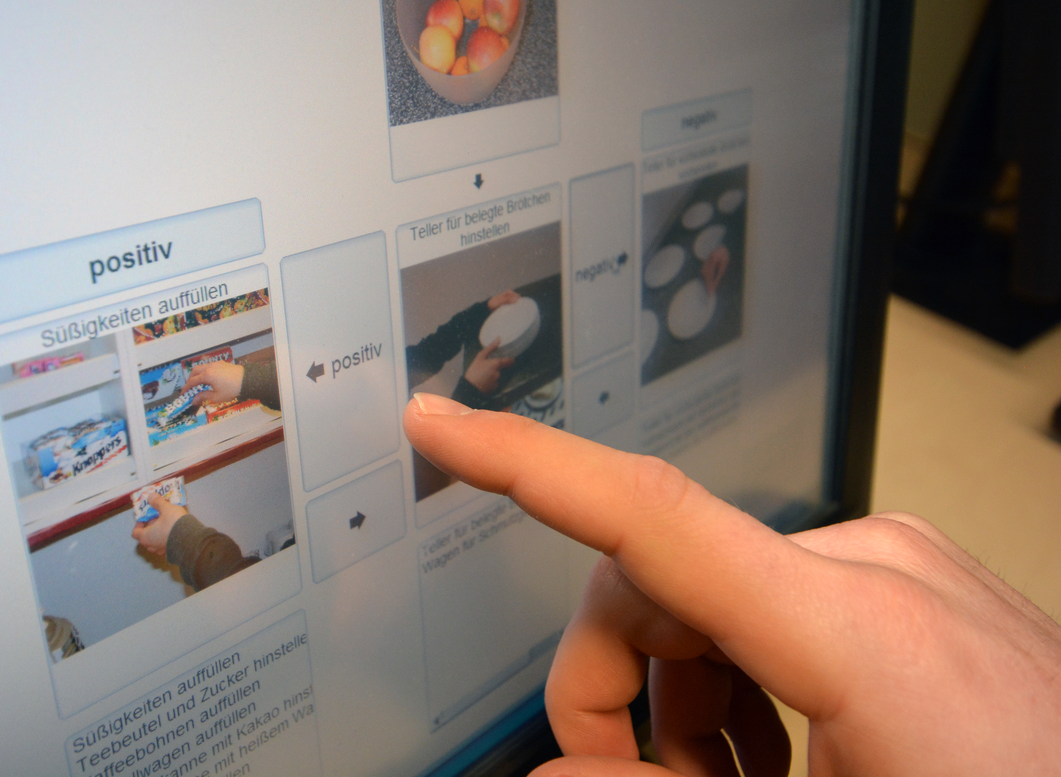 Bild: Berufstätige mit Handicap schieben und sortieren auf dem Bildschirm ihre Arbeitsabläufe und lernen damit für den Alltag im Kiosk. Foto: Universität BielefeldBildnummer: 97081