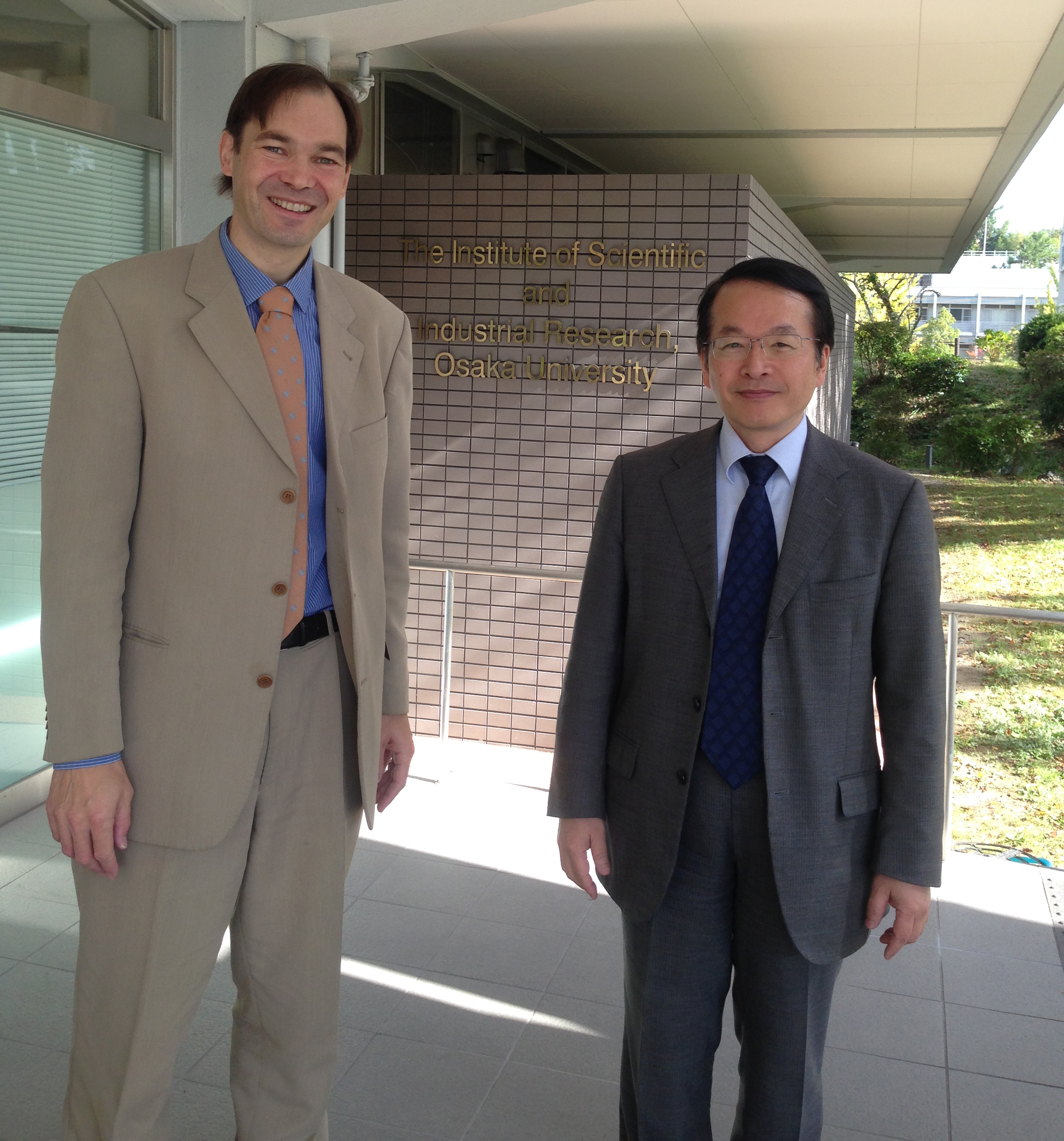Prof. Dr. Harald Gröger von der Universität Bielefeld mit seinem japanischen Gastgeber, Prof. Dr. Hiroaki Sasai von der Universität Osaka vor dem „Institute of Scientific and Industrial Research“. Foto: Universität Bielefeld