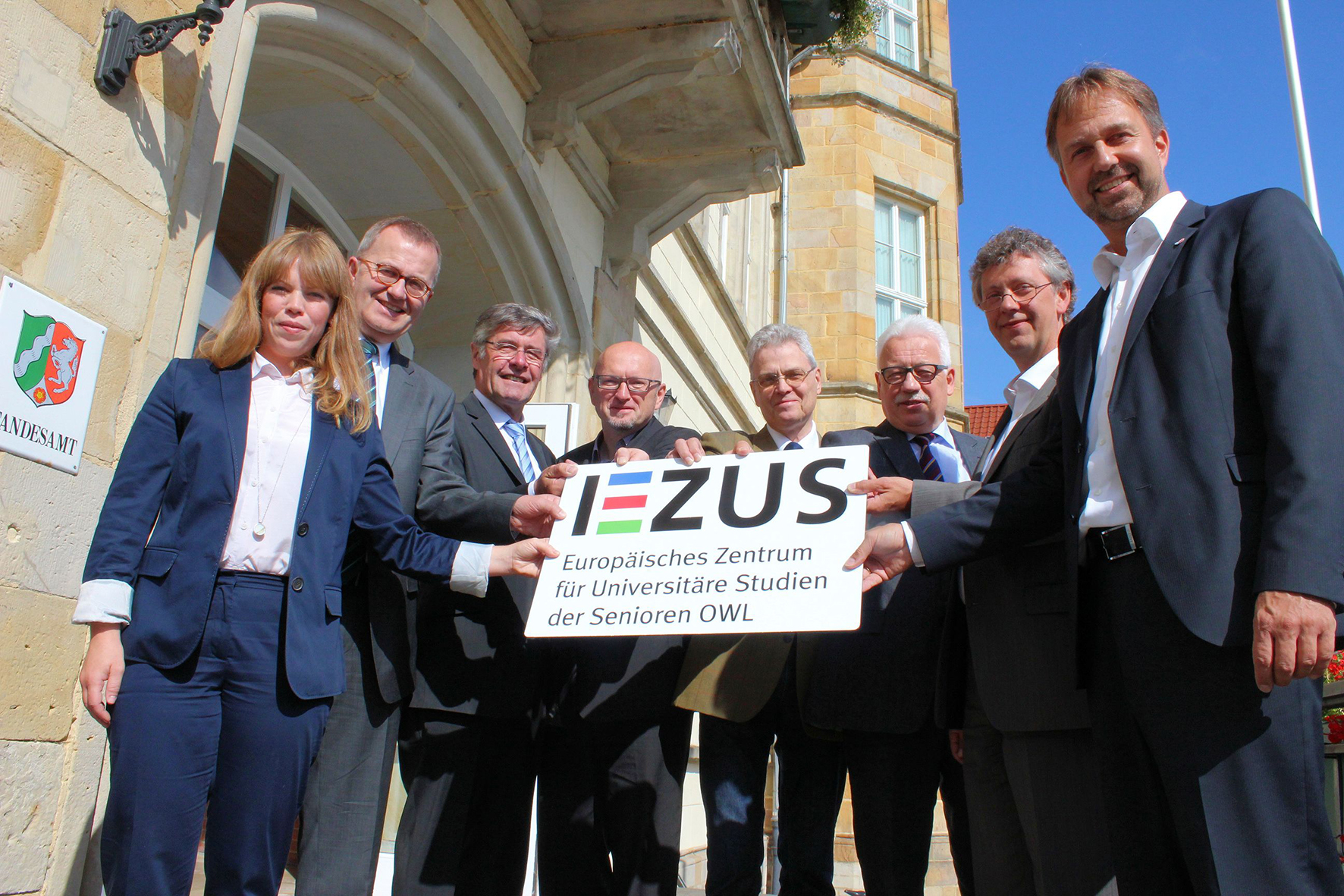 Freuen sich auf die gemeinsame Zusammenarbeit (v.l.): Nathalie Bender (Leitung EZUS), Prof. Dr. Martin Egelhaaf (Prorektor für Forschung, wissenschaftlichen Nachwuchs und Transfer der Universität Bielefeld), Landrat Friedel Heuwinkel, Prof. Dr. Wolfgang Jütte (Vorstandsvorsitzender Zentrum für wissenschaftliche Weiterbildung), Eberhard Block (Bürgermeister Stadt Horn-Bad Meinberg), Peter Schwarze (Vorstandsvorsitzender Verein zur Förderung von Innovation in der Gesundheitswirtschaft OWL e.V), Uwe Borchers (Geschäftsführer ZIG gGmbH) und Markus Rempe (Vorstandsvorsitzender Lippe Bildung eG). Foto: Malik Schacht