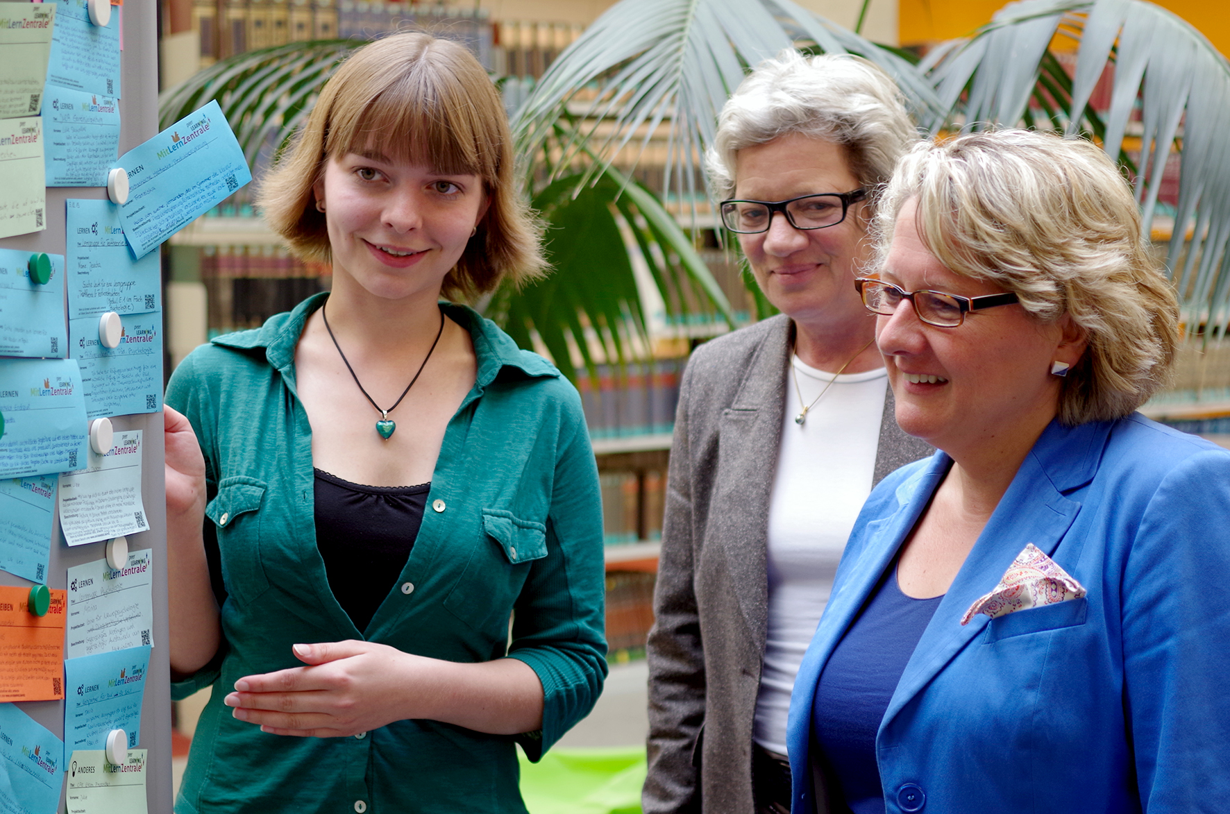 Lisa Fischer (links), Tutorin der Mitlernzentrale an der Universität Bielefeld, erklärt NRW-Wissenschaftsministerin Svenja Schulze (rechts), wie die Lern- und Schreibpartnerbörse funktioniert. Dr. Andrea Frank (Mitte), Leiterin des Zentrums für Studium, Lehre, Karriere (SLK), informierte die Ministerin bei dem Termin über die Studienstart-Programme an der Universität.