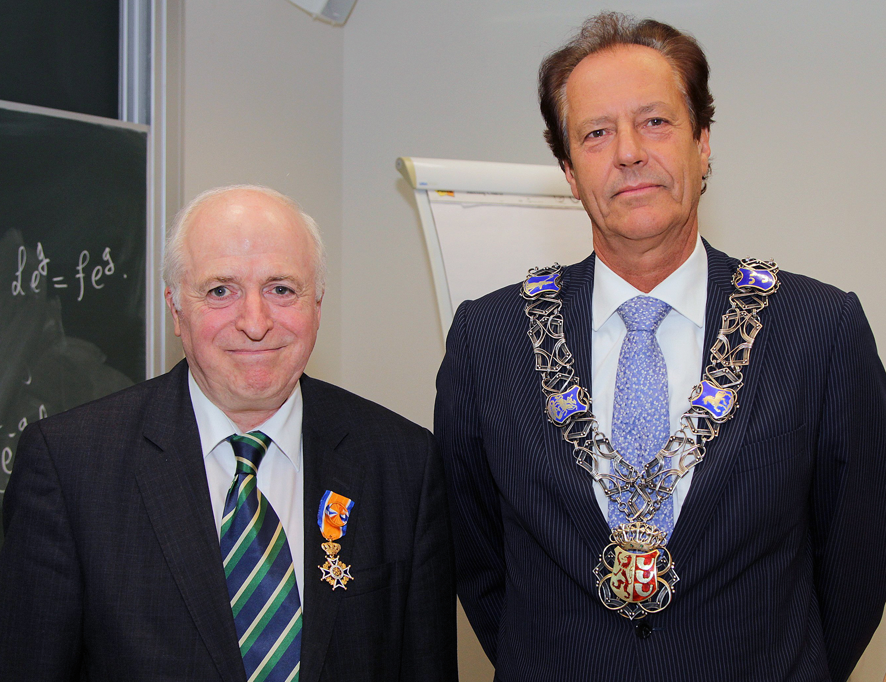 Er erfuhr erst vor Ort von der königlichen Ehrung: Professor Dr. Friedrich Götze (links) von der Universität Bielefeld ist neues Mitglied im niederländischen Orden von Oranien-Nassau. Rob van Gijzel (rechts), Bürgermeister von Eindhoven, verlieh dem Mathematiker den Ordner.