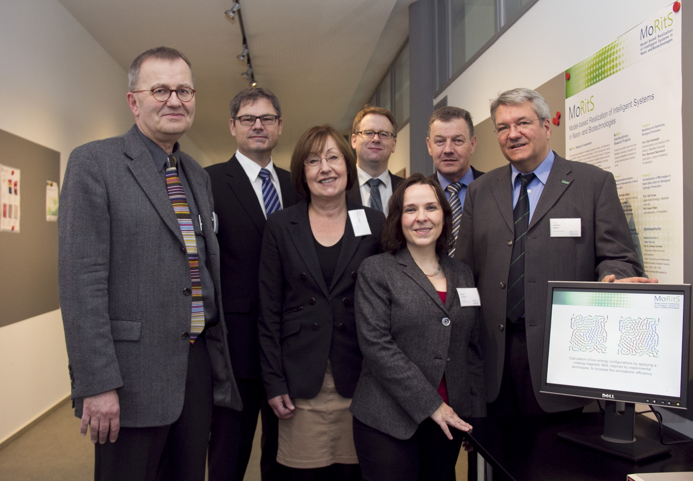 Prof. Dr. Martin Egelhaaf (Universität Bielefeld), Dr. Christoph von der Heiden (Industrie- und Handelskammer), Präsidentin der FH Bielefeld Prof. Dr. Beate Rennen-Allhoff, Prof. Dr. Axel Schneider (FH Bielefeld), MoRitS-Geschäftsführerin Bettina Krammer, Bürgermeister Detlef Helling und Prof. Dr. Andreas Hütten (Universität Bielefeld) (v.l.). Foto: Maxi Krähling