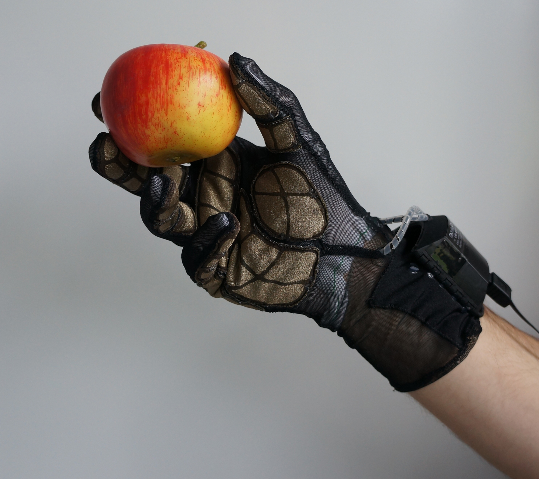 Mit einem Sensorhandschuh nehmen Wissenschaftler des Exzellenzclusters CITEC den Ablauf menschlicher Handbewegungen auf. Ein ähnlicher Handschuh könnte künftig dazu dienen, aus der Ferne Berührungsdaten an die Hände zu übermitteln. Foto: Universität Bielefeld