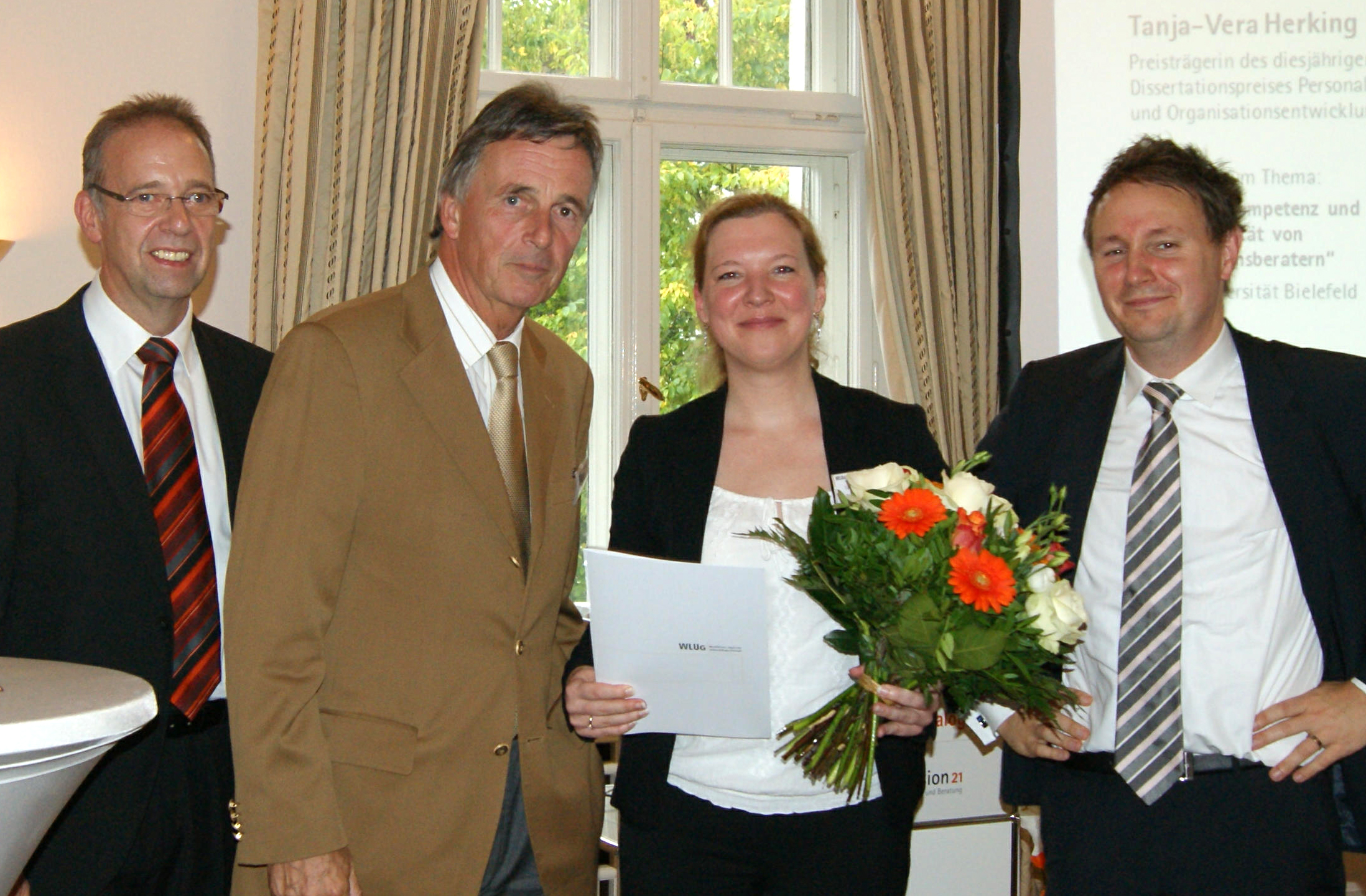 Helge Werner (dimension 21), Werner Efing (WLUG) und Christian Kuhlmann (dimension 21) (v.l.) mit Preisträgerin Tanja-Vera Herking. Foto: dimension 21
