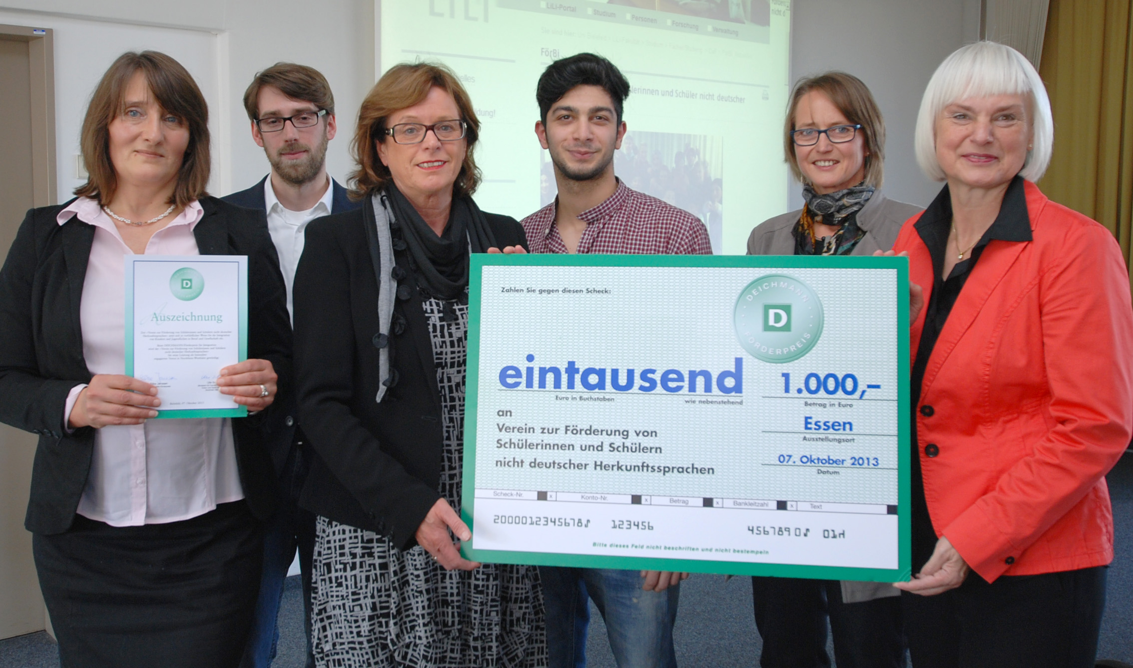 Projektleiterin Dr. Beatrix Hinrichs, Student und Förderlehrer Heinrich Köhne, Ministerin Ute Schäfer, Förderschüler Taylan Sürücü, Prof. Dr. Claudia Riemer (wissenschaftliche Leitung) und Silke Janssen (Deichmann).