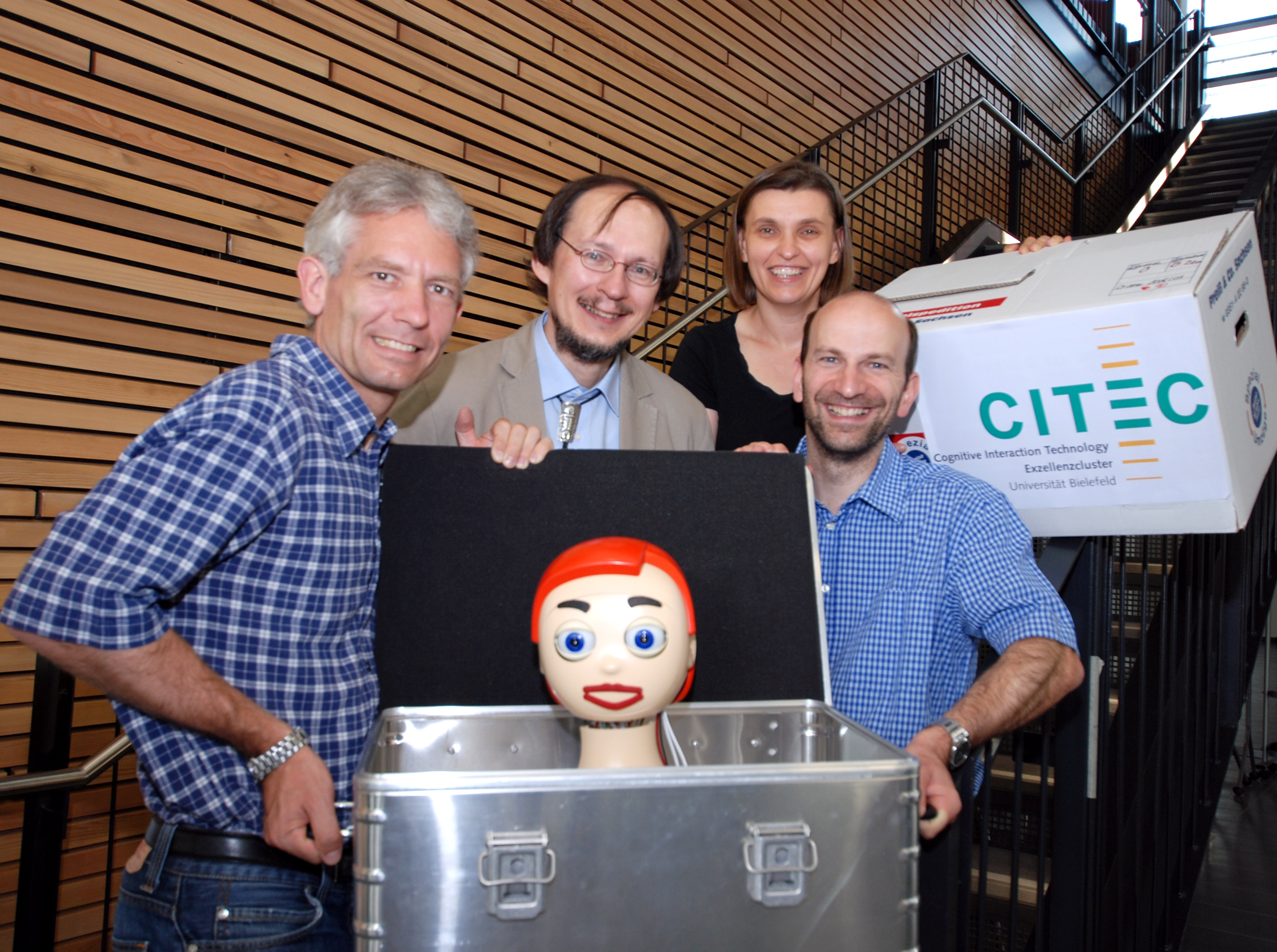 Dr. Sven Wachsmuth (Leiter des Zentrallabors), Prof. Dr. Helge Ritter, CITEC-Geschäftsführerin Anita Adamczyk und Dr. Robert Haschke (Planungs- und Umzugskoordinator für den CITEC-Forschungsbau) mit dem Bielefelder Roboterkopf Flobi. Foto: Universität Biele-feld