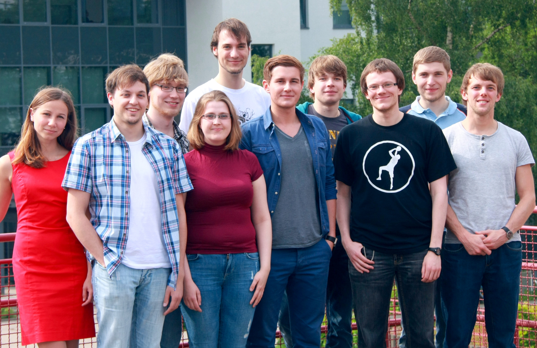 Das iGEM-Team der Universität Bielefeld 2013: Nadiya Romanova, Tom Tubbesing, Fabian Thomas, Tore Bleckwehl, Matthias Ruwe (hinten v. l.); Manuel Schüler, Anna Korszańska, Lukas Rositzka, Thorben Meyer, Sebastian Grenz (vorne v. l.). Foto: iGEM-Team 2013
