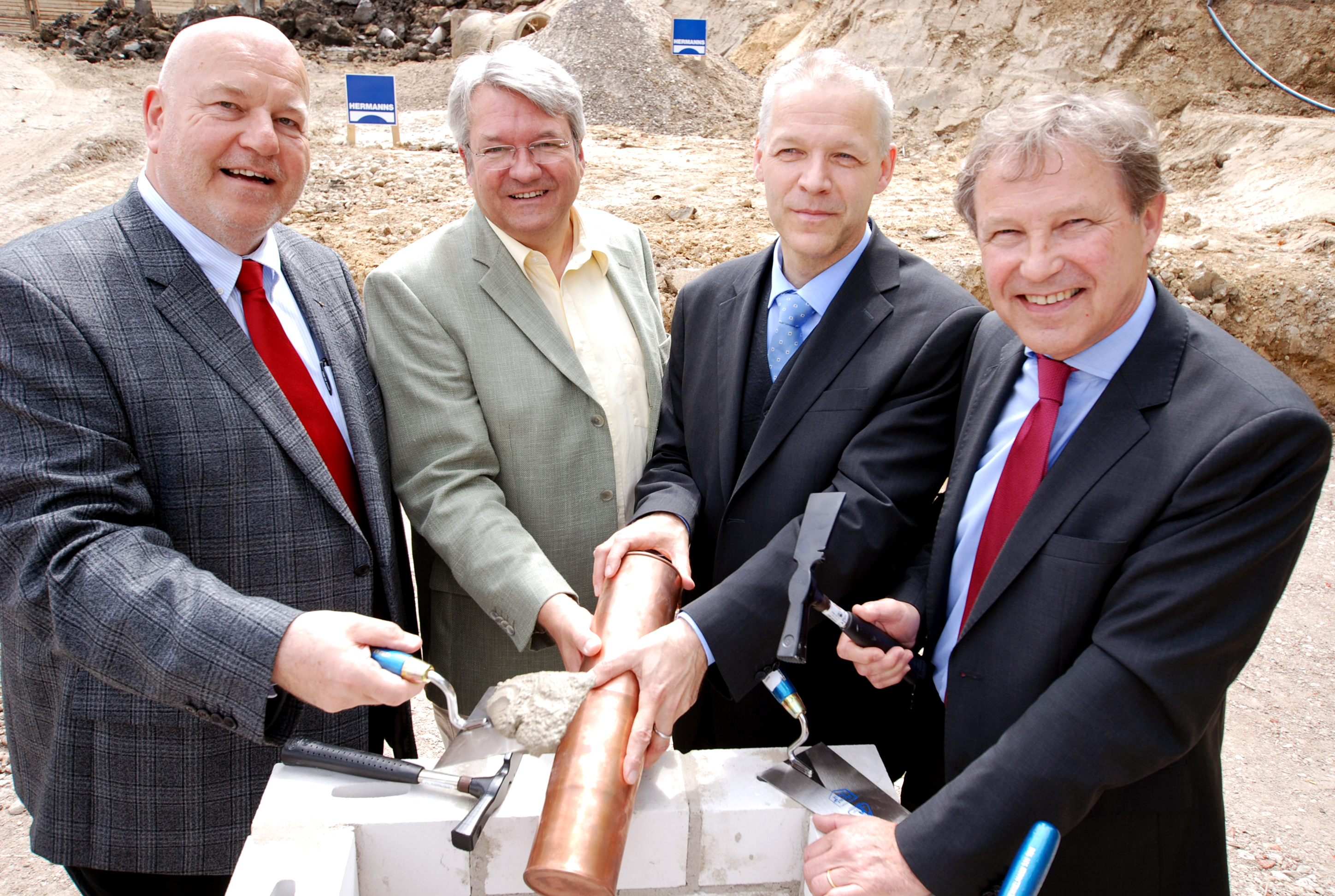 Heinrich Micus, Prof. Dr. Andreas Hütten, Dr. Martin Chaumet und Hans-Jürgen Simm (v.l.) versenken die Kapsel mit der Urkunde im Grundstein.