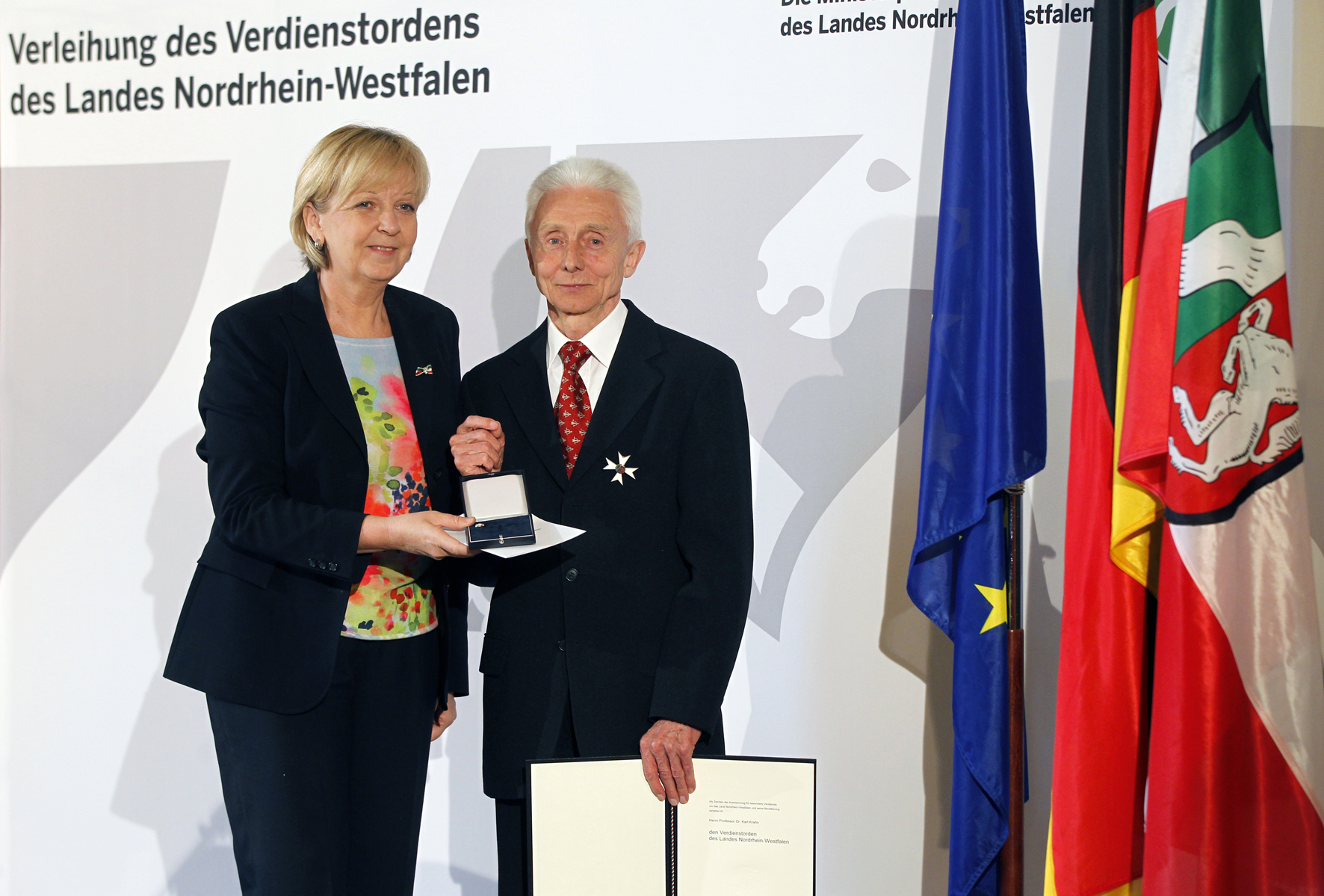 Ministerpräsidentin Hannelore Kraft hat den Landesverdienstorden an Prof. em. Dr. Karl Krahn der Universität Bielefeld verliehen. Foto: Roberto Pfeil