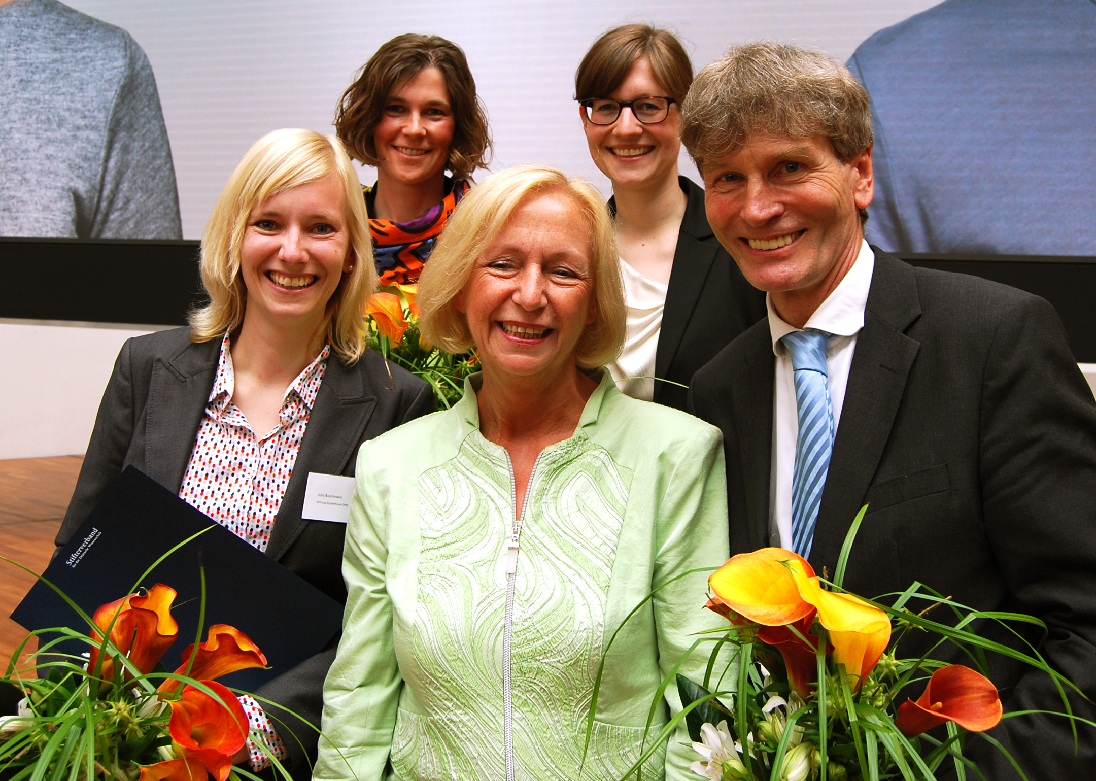 Julia Buschmann, Katja Urhahne, Friederike Ruwisch und Prof. Dr. Nikolaus Risch mit der Bundesministerin für Bildung und Forschung Johanna Wanka.