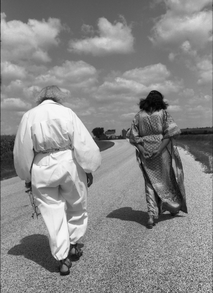 Plakatmotiv zur Ausstellung in der Universität Bielefeld – der mexikanische Yogalehrer José Manuel Estrada und eine Begleiterin auf einer Landstraße in Wisconsin, USA. Foto: Claudius B. Claiborne