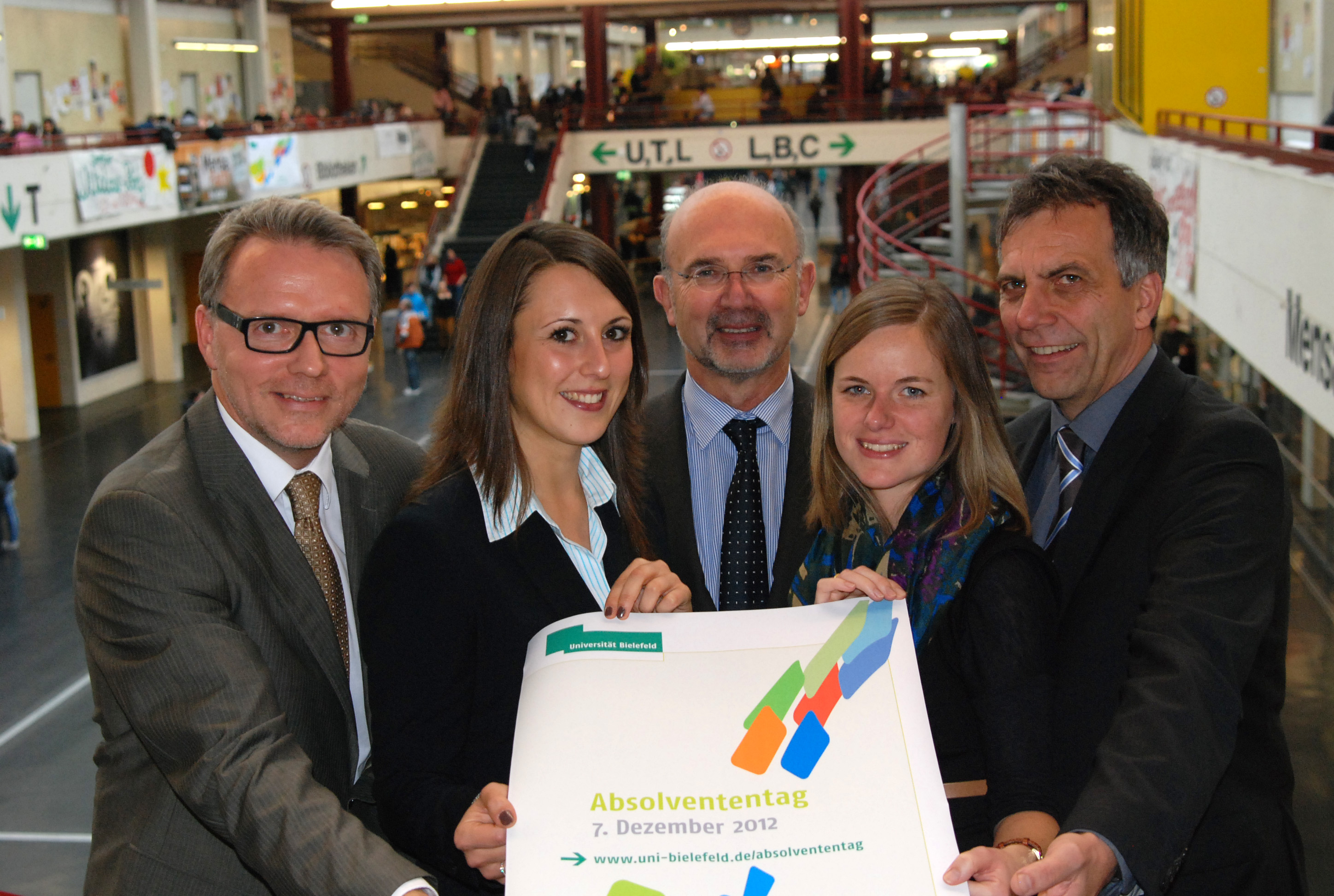 Rektor Prof. Dr.-Ing. Gerhard Sagerer (rechts) freut sich gemeinsam mit den Sponsorenvertetern (v.l.) Gernot Wolf (arvato), Inga Vogel (itelligence) und Herbert Vogel (itelligence und Westfälisch-Lippische Universitätsgesellschaft) sowie Julia Homburg (Projektleiterin, Universität Bielefeld) auf die erste universitätsweite Absolventenfeier der Universität Bielefeld und einen feierlichen Studienabschluss für die Absolventinnen und Absolventen des Jahrgangs 2012.
