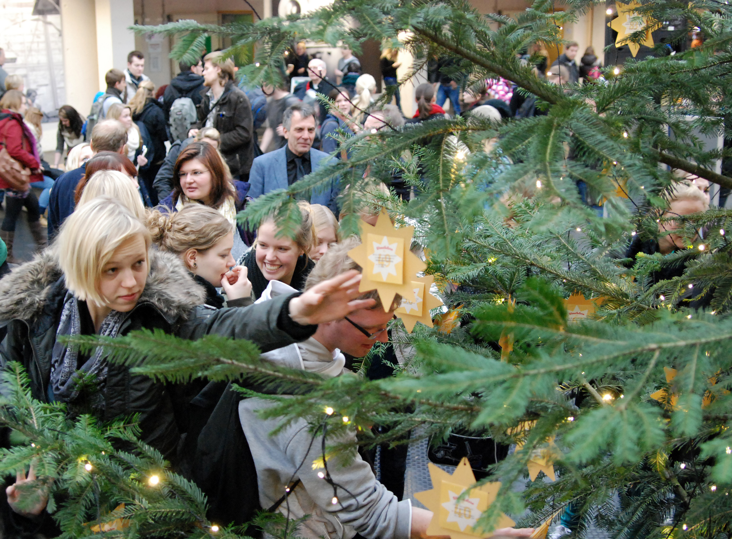 Direkt nach der Freigabe des Wunschbaums pflückten Studierende und Beschäftigte der Universität die ersten Wünsche von den Sternen.