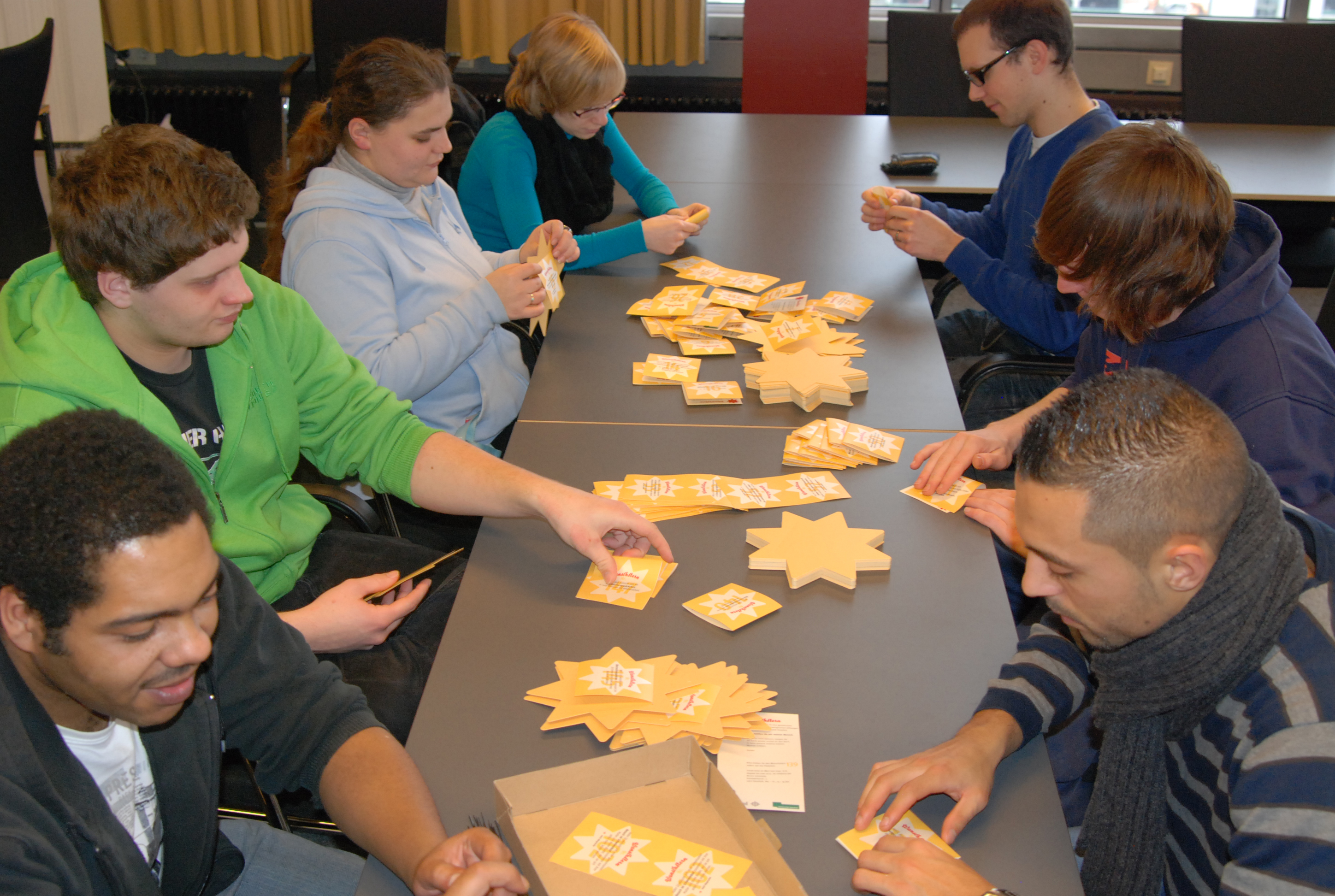 Bild:  Auszubildende haben in diesem Jahr die goldenen Sterne mit den Wunschzetteln und den Aufhängern für den Baum versehen.Bildnummer: 86420