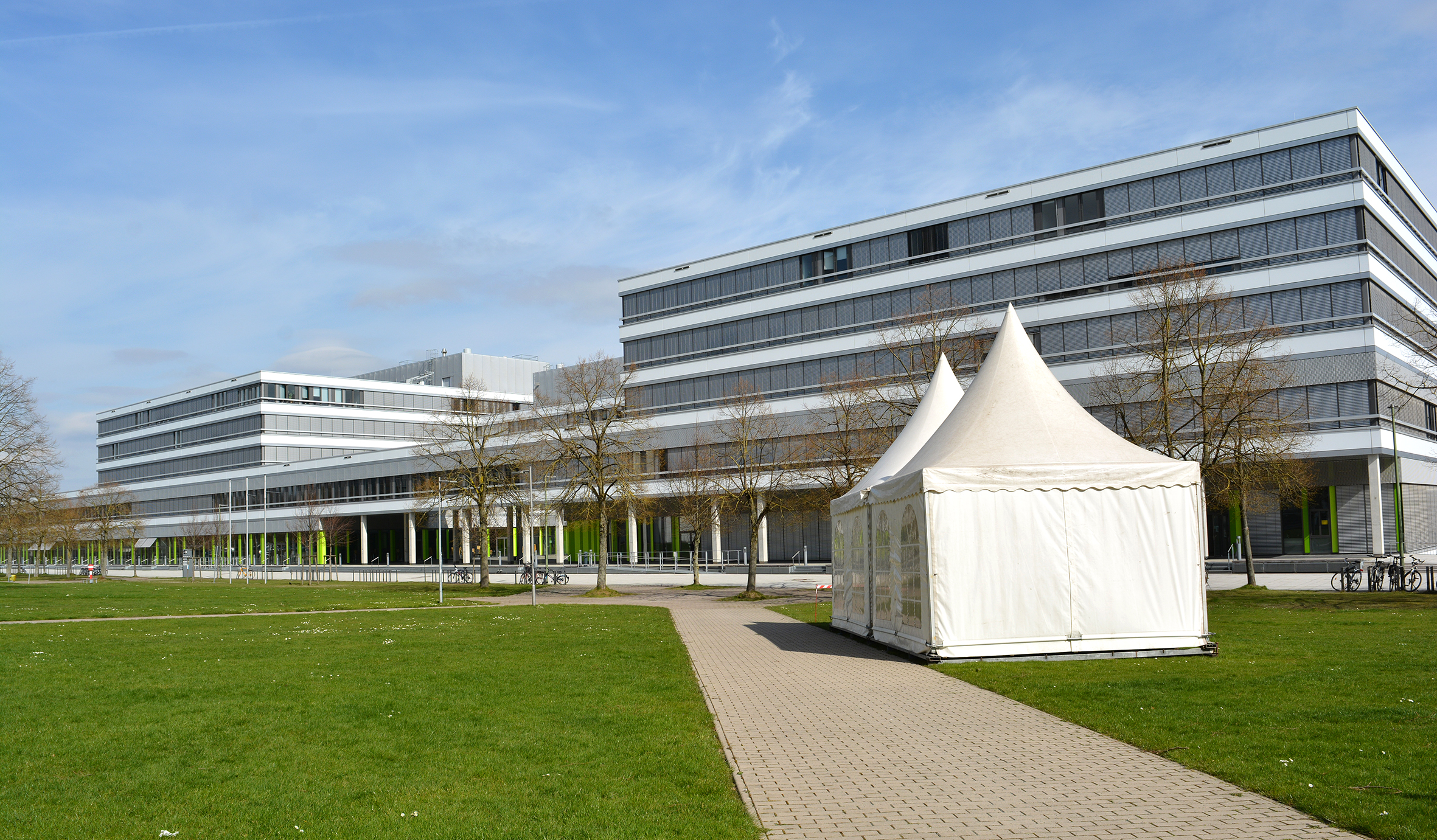 In einem Zelt auf der Uni-Wiese können sich neue Studierende im April eine Tasche mit Uni-Schriftzug abholen.