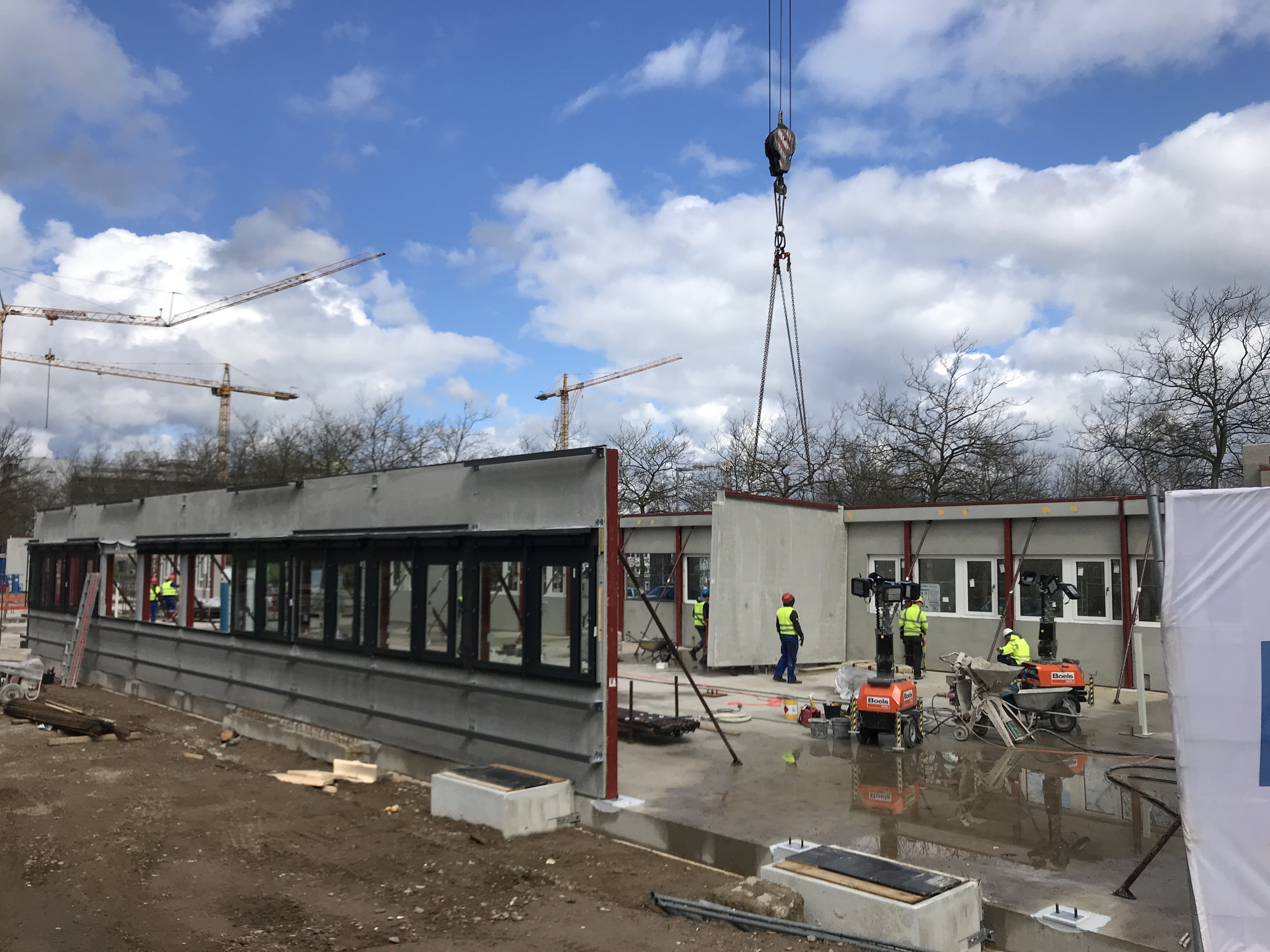 Auf der Baustelle des Gebäudes R.2 werden erste Außenwandelemente montiert.