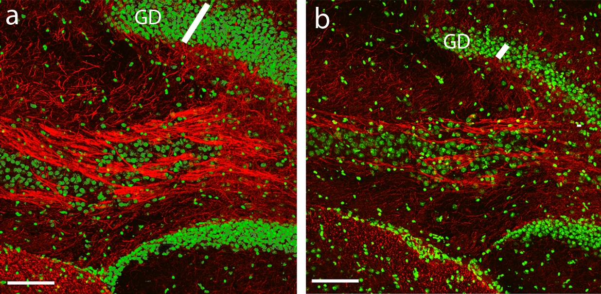 Die Nervenzellen (Zellkerne in grün) senden „Kabel“ (die Axone, in rot) aus, um sich untereinander zu verbinden. Diese Verbindung der Nervenzellen ist gewöhnlich gut ausgeprägt (Bild links). Bielefelder Forscher zeigten nun, dass erheblich weniger Verbindungen und Nervenzellen wachsen, wenn der Stoff NF-kB gehemmt wird (Bild rechts), so dass die Leistungsfähigkeit rapide abnimmt.