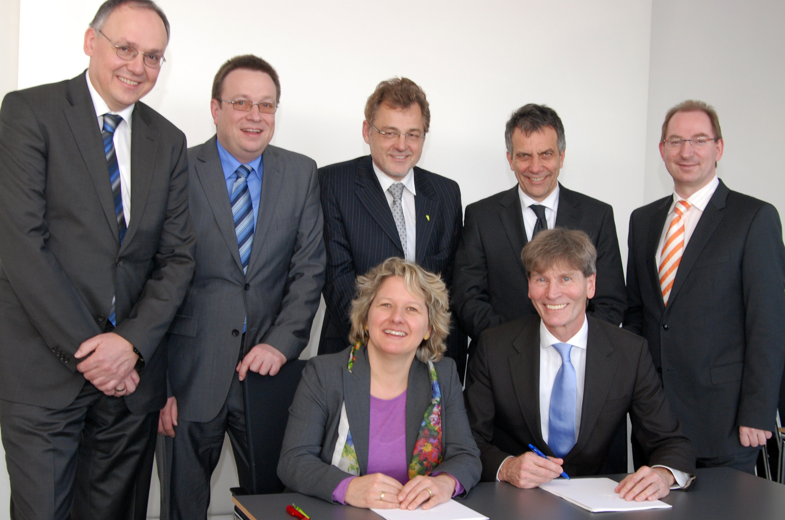 Unterzeichneten in der Universität Bielefeld die Zielvereinbarung mit der Wissenschaftsministerin Svenja Schulze (v.l.): Karl-Heinz Sandknop (Vizepräsident Hochschule Hamm-Lippstadt), Professor Klaus Zeppenfeld (Präsident Hochschule Hamm-Lippstadt), Professor Friedrich Biegler-König (Vizepräsident Fachhochschule Bielefeld), Professor Gerhard Sagerer (Rektor der Universität Bielefeld), Professor Nikolaus Risch (Präsident Universität Paderborn) und Dr. Oliver Herrmann (Präsident Hochschule Ostwestfalen-Lippe).