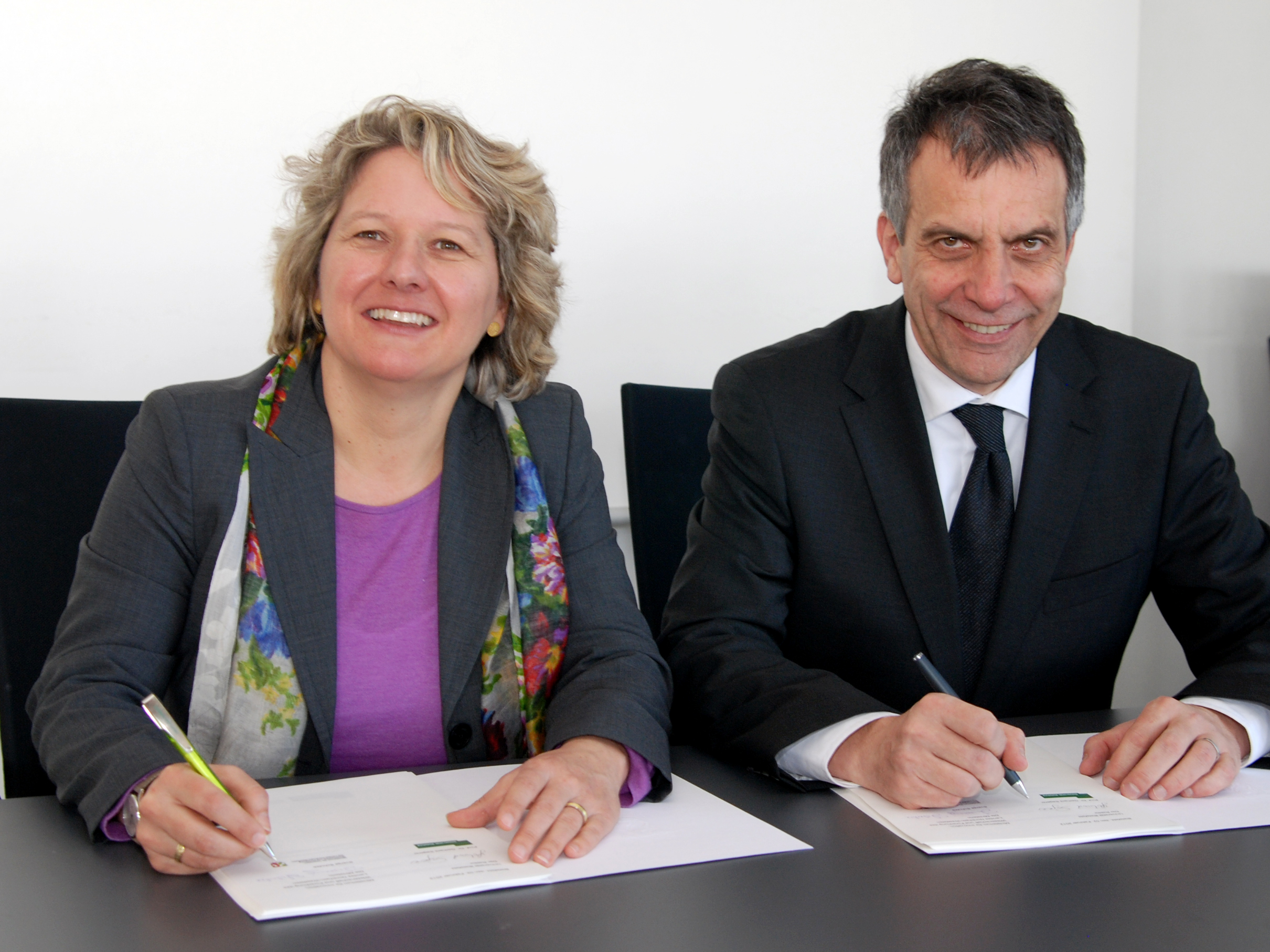 NRW-Wissenschaftsministerin Svenja Schulze und der Rektor der Universität Bielefeld, Prof. Dr.-Ing. Gerhard Sagerer, unterzeichnen die Ziel- und Leistungsvereinbarung für 2012 und 2013.