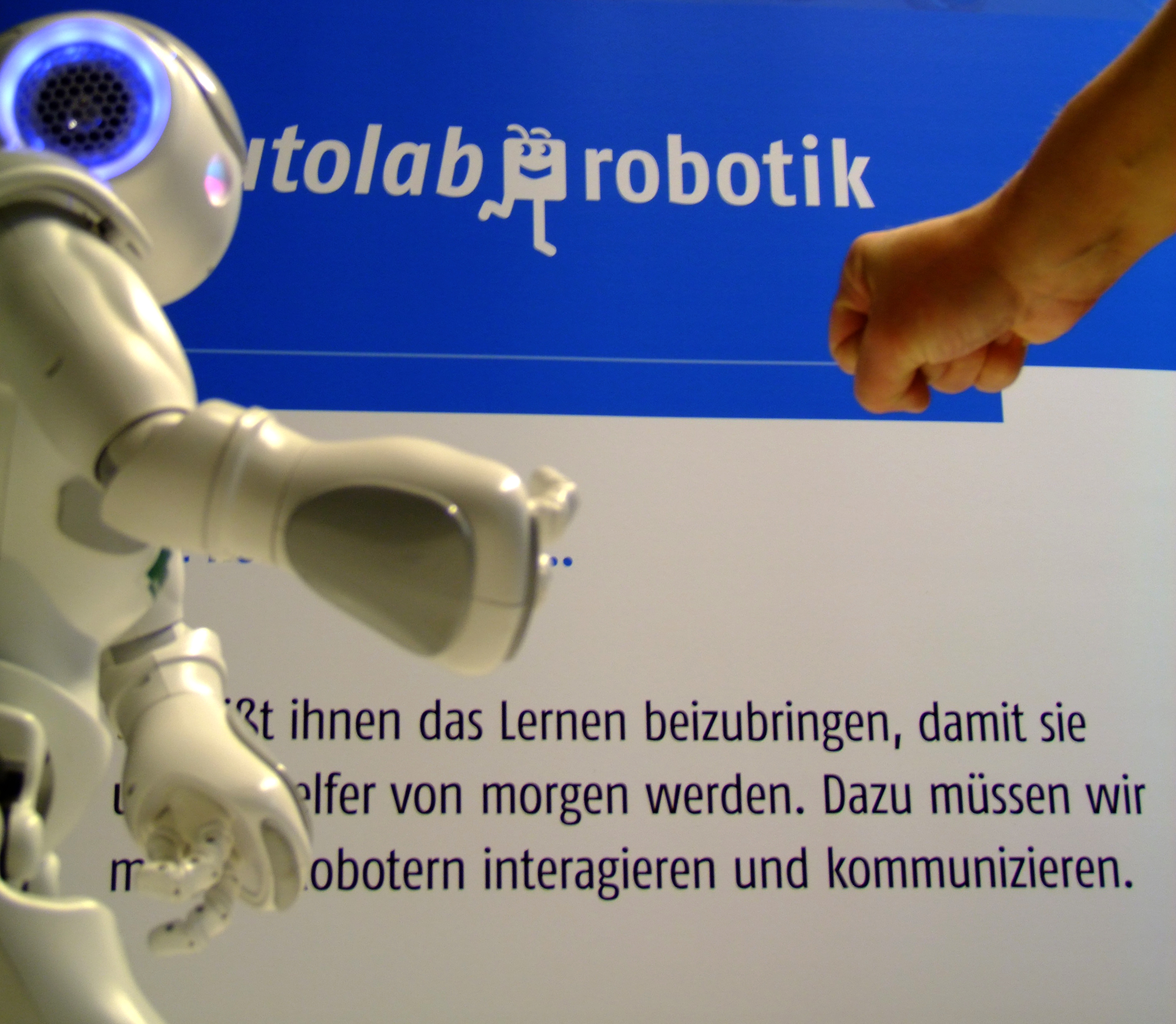 Roboter NAO aus dem teutolab-robotik der Universität Bielefeld kann sehen, hören, sprechen, tasten und kommunizieren – oder wie hier Schnick schnack schnuck spielen.