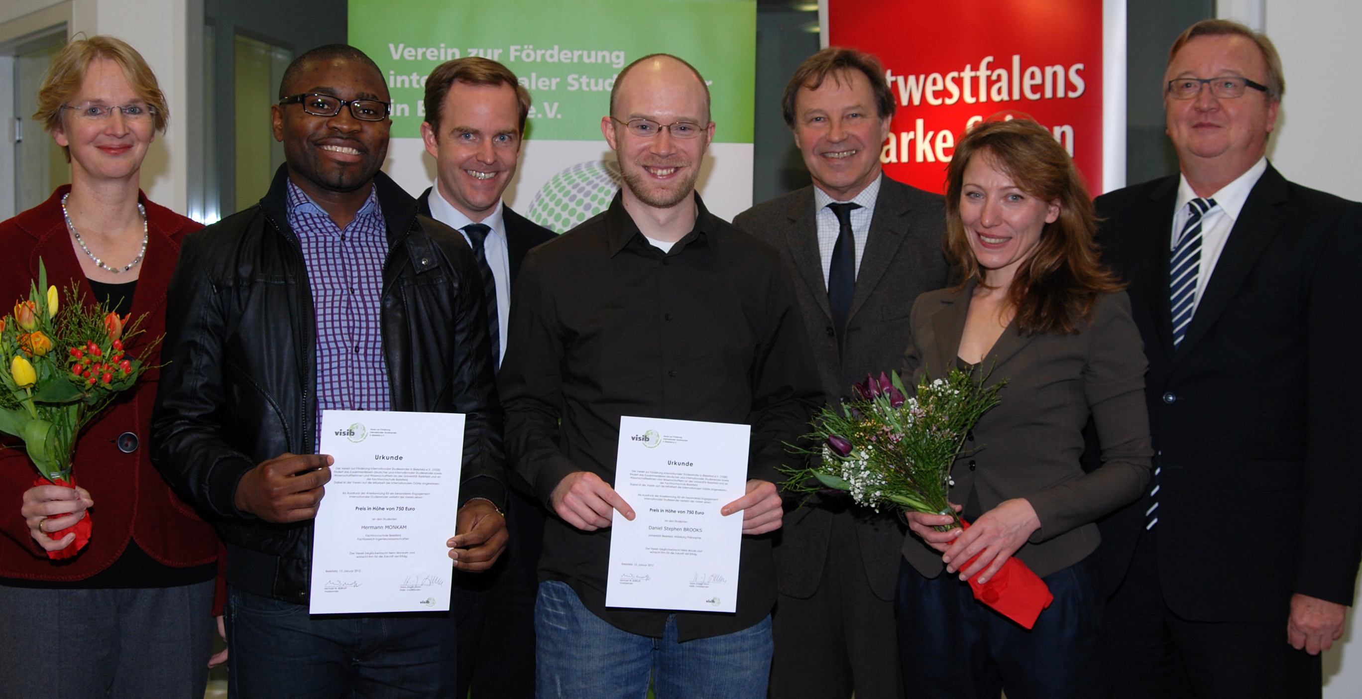 Preisvergabe: Corinna Hirschberg, Hermann Monkam, Michael W. Böllhoff, Daniel Brooks, Hans-Jürgen Simm, Juniorprofessorin Dr. Maria Kronfeldner und Axel Frick (v.l.).