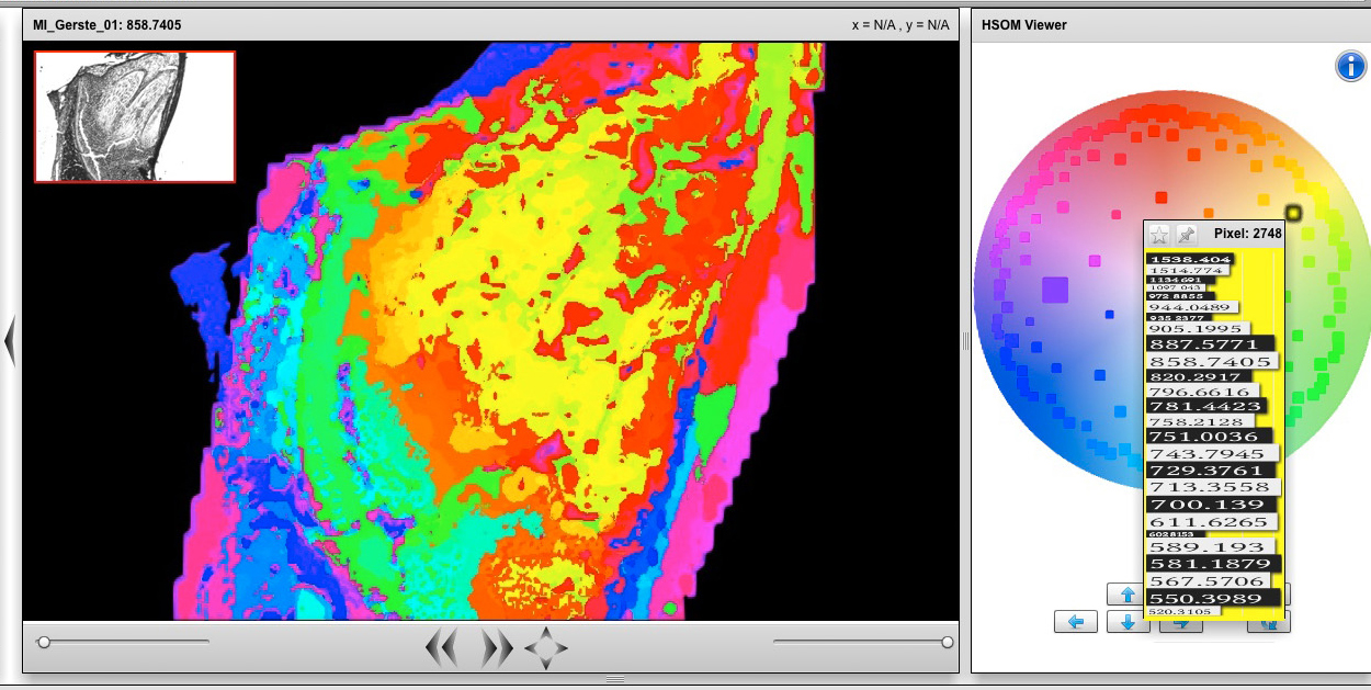 Bild: Der Dünnschnitt durch einen Keimling der Gerste (kleines sw-Bild) wurde mit Hilfe der bildgebenden Massenspektrometrie untersucht. Dazu wurde das Präparat mit einem Laser abge-tastet und in zirka 20.000 Punkten wurden Massenspektren aufgenommen.  Bildnummer: 76598