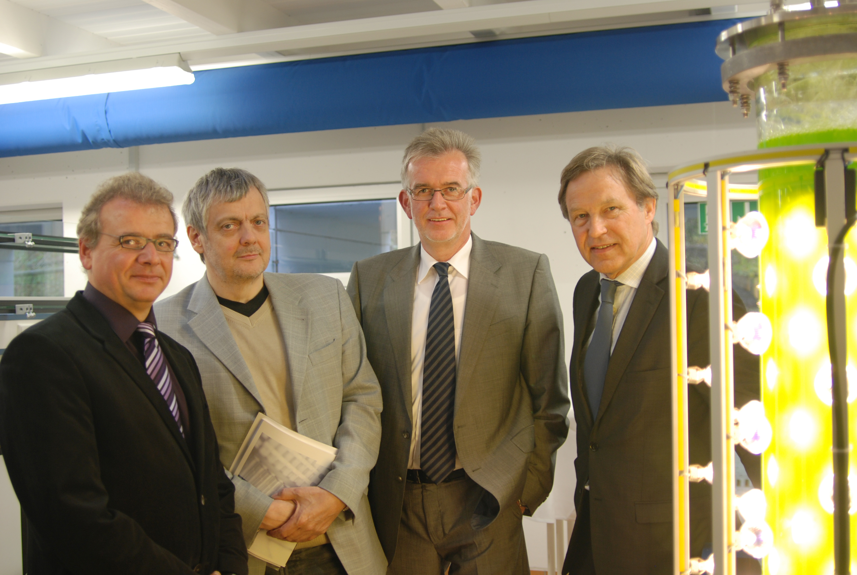 Im Licht eines Photobioreaktors im neuen BioEnergieTechnikum: Professor Dr. Olaf Kruse, Pro-rektor und Rektorvertreter Professor Dr. Rolf König, Friedhelm Rieke, Geschäftsführer der Stadtwerke Bielefeld, und Hans-Jürgen Simm, Kanzler der Universität Bielefeld (v.l.).