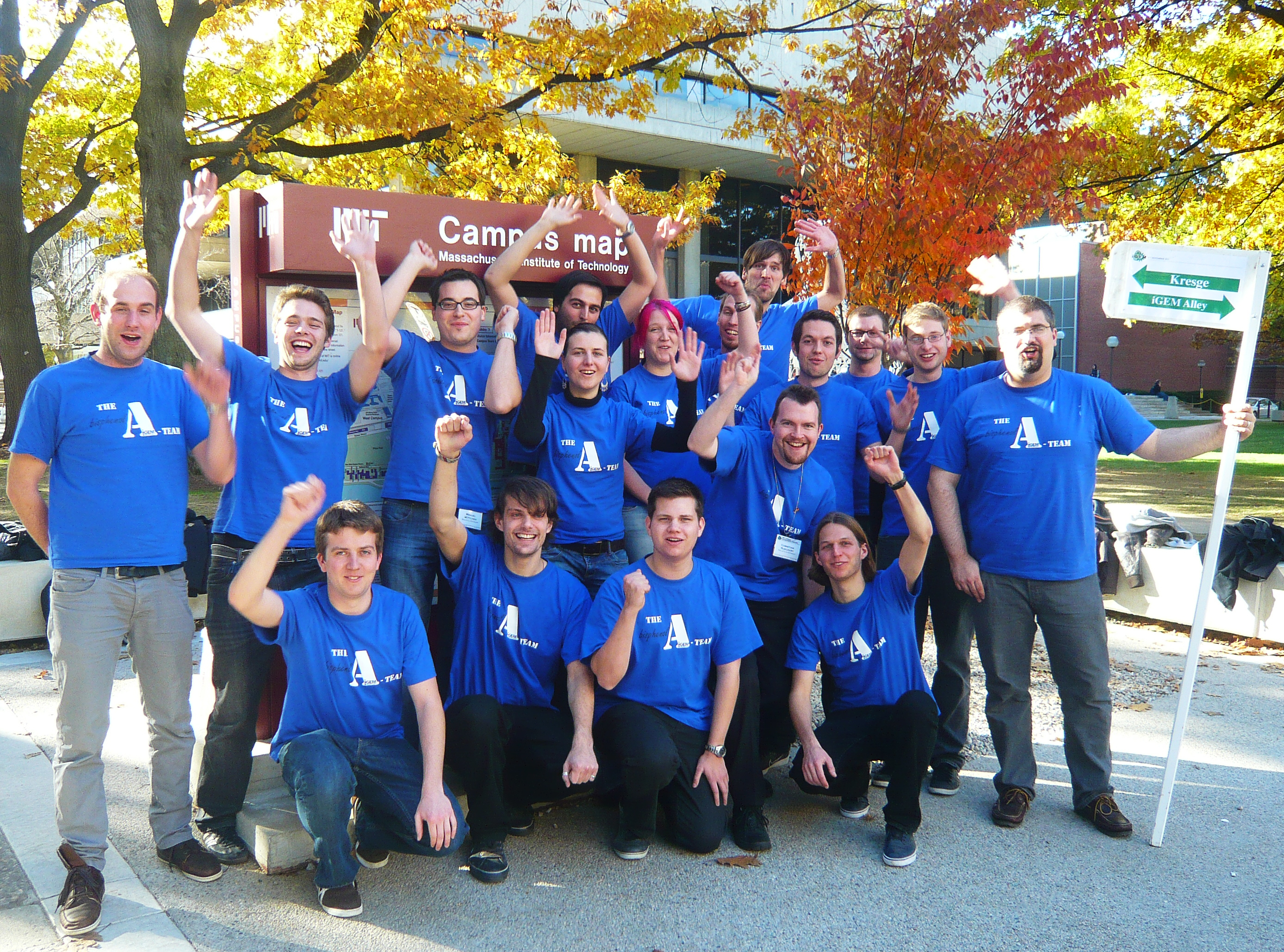 A wie in Bisphenol A: Das selbst ernannte A-Team der Universität Bielefeld konnte sich in Boston über sein gutes Abschneiden freuen. Vorne v.l.: Timo Wolf, Michael Limberg, Jan Schwarzhans, Simon Schäper; Mitte v.l.: Anna Drong, Christian Rückert, Panagiotis Papavasiliou, Dominik Cholewa, Nils Lübke, Maurice Telaar; hinten v.l.: Robert Braun, Jonas Aretz, Manuel Wittchen, Armin Neshat, Katharina Thiedig, Niko Kessler, Matthias Eder