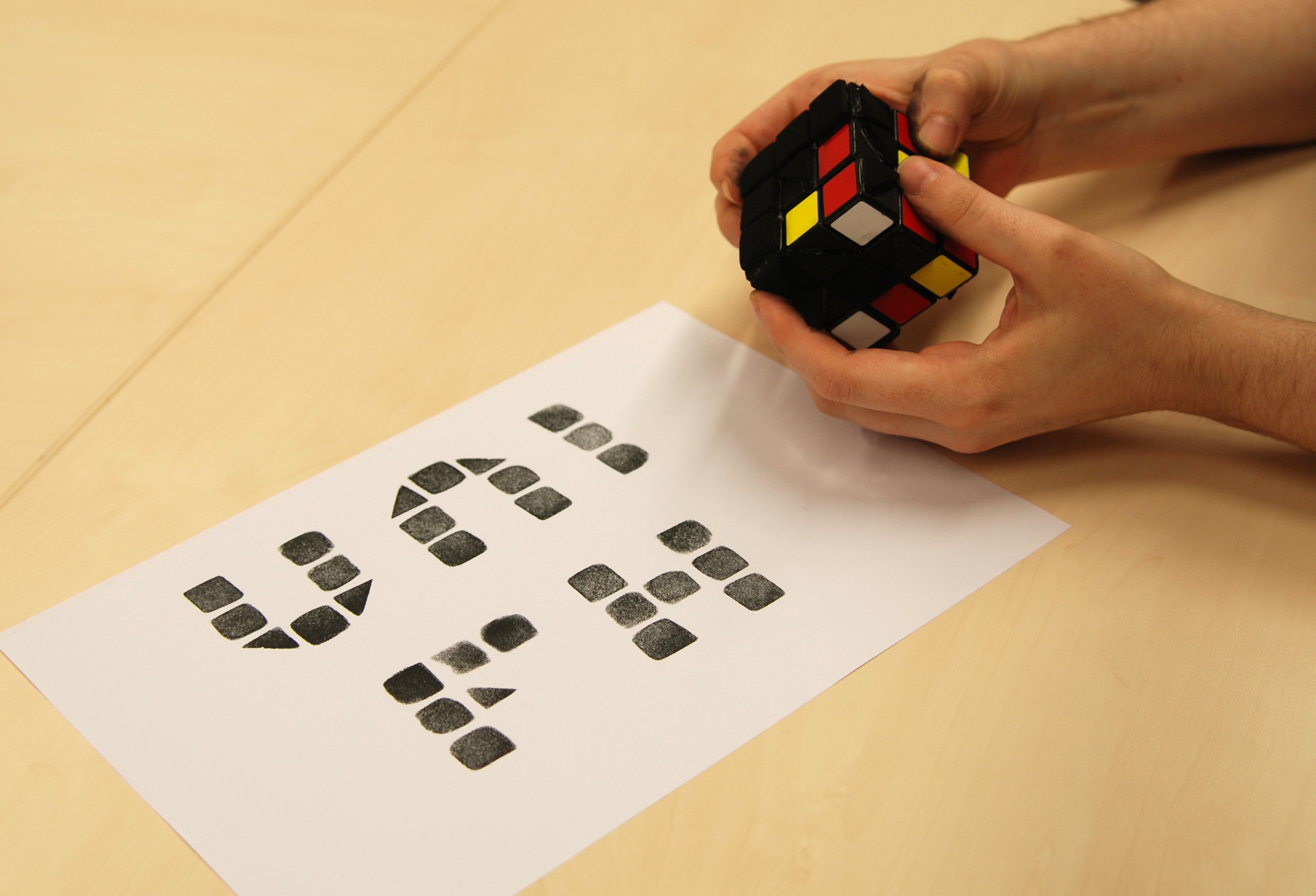Mit dem zum Stempel umfunktionierten Zauberwürfel des Studenten Jan Schwarz können Besucherinnen und Besucher das ganze Alphabet drucken - wenn sie Geduld mitbringen.