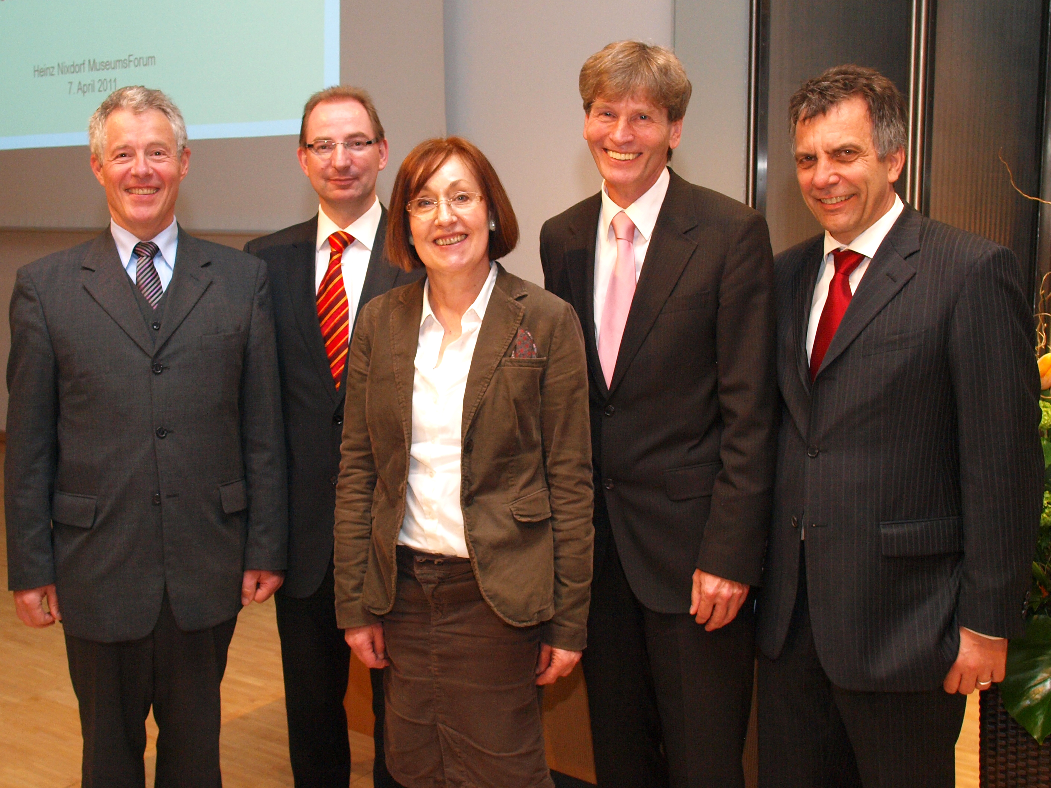 Vorstand der Stiftung Studienfonds OWL (v.l.): Prof. Martin Christian Vogel, Rektor der Hochschule für Musik Detmold, Dr. Oliver Herrmann, Präsident der Hochschule OWL, Prof. Dr. Beate Rennen-Allhoff, Präsidentin der Fachhochschule Bielefeld, Prof. Dr. Nikolaus Risch, Präsident der Universität Paderborn, Prof. Dr.-Ing. Gerhard Sagerer, Rektor der Universität Bielefeld
