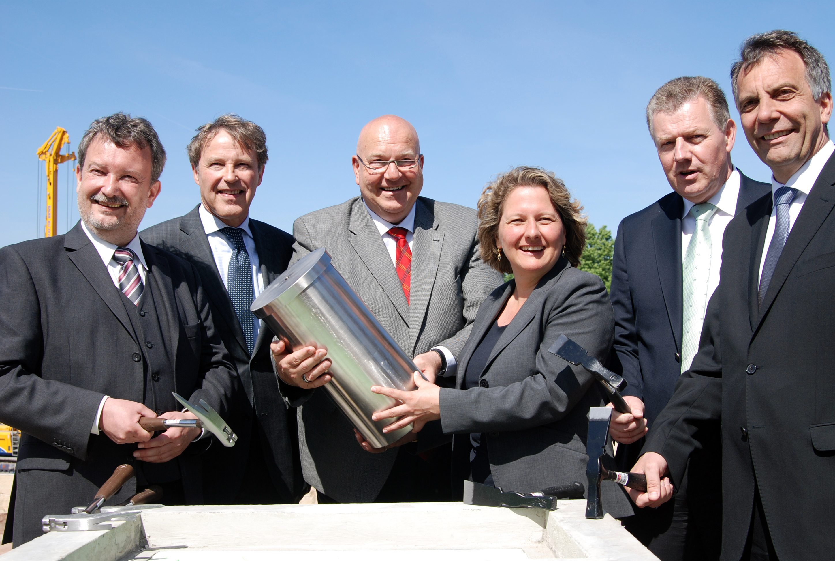 Reginbert Taube (Geschäftsbereichsleiter des BLB NRW), Hans-Jürgen Simm (Kanzler der Universität Bielefeld), Heinrich Micus (Niederlassungsleiter Bielefeld des BLB NRW), Wissenschaftsministerin Svenja Schulze, Detlef Helling (Bürgermeister der Stadt Bielefeld) und Prof. Dr.-Ing. Gerhard Sagerer (Rektor der Universität Bielefeld) (v.l.)