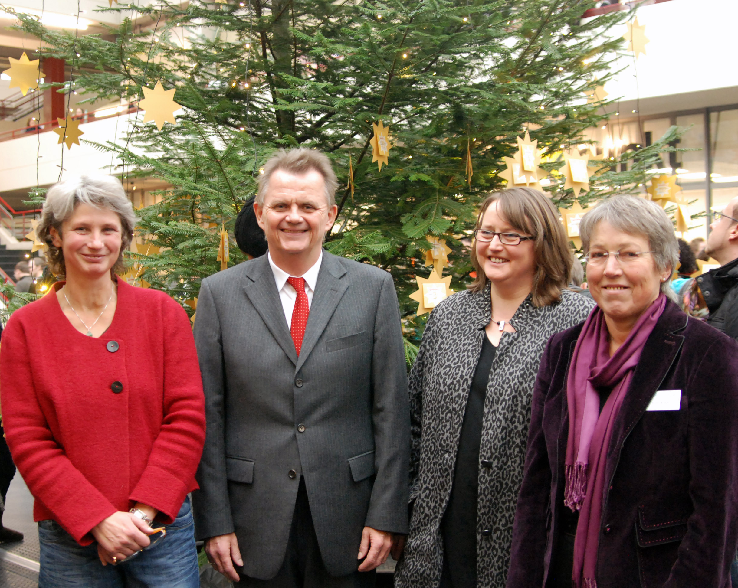 Freuen sich über den gelungenen Start der dritten Wunschstern-Aktion: Susanne Stelbrink (stellv. Leitung Neue Schmiede), Dr. Günther Wienberg (Vorstandsmitglied der von Bodelschwinghschen Stiftungen), Dr. Claudia Riemer (Prorektorin Universität Bielefeld) und Evelin Krüger (Freiwilligenagentur Bethel) (von links).