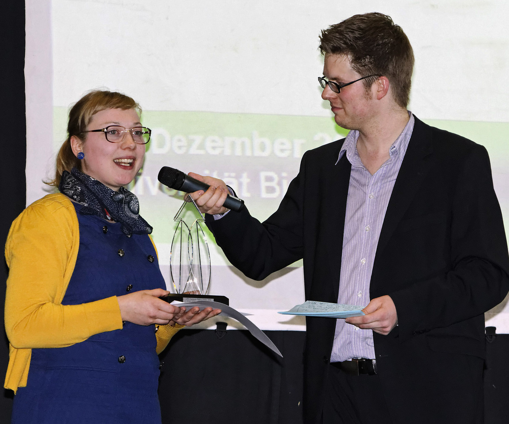 Bild: Preisträgerin Kathrin Sielker im Gespräch mit Moderator Jörg Heeren.