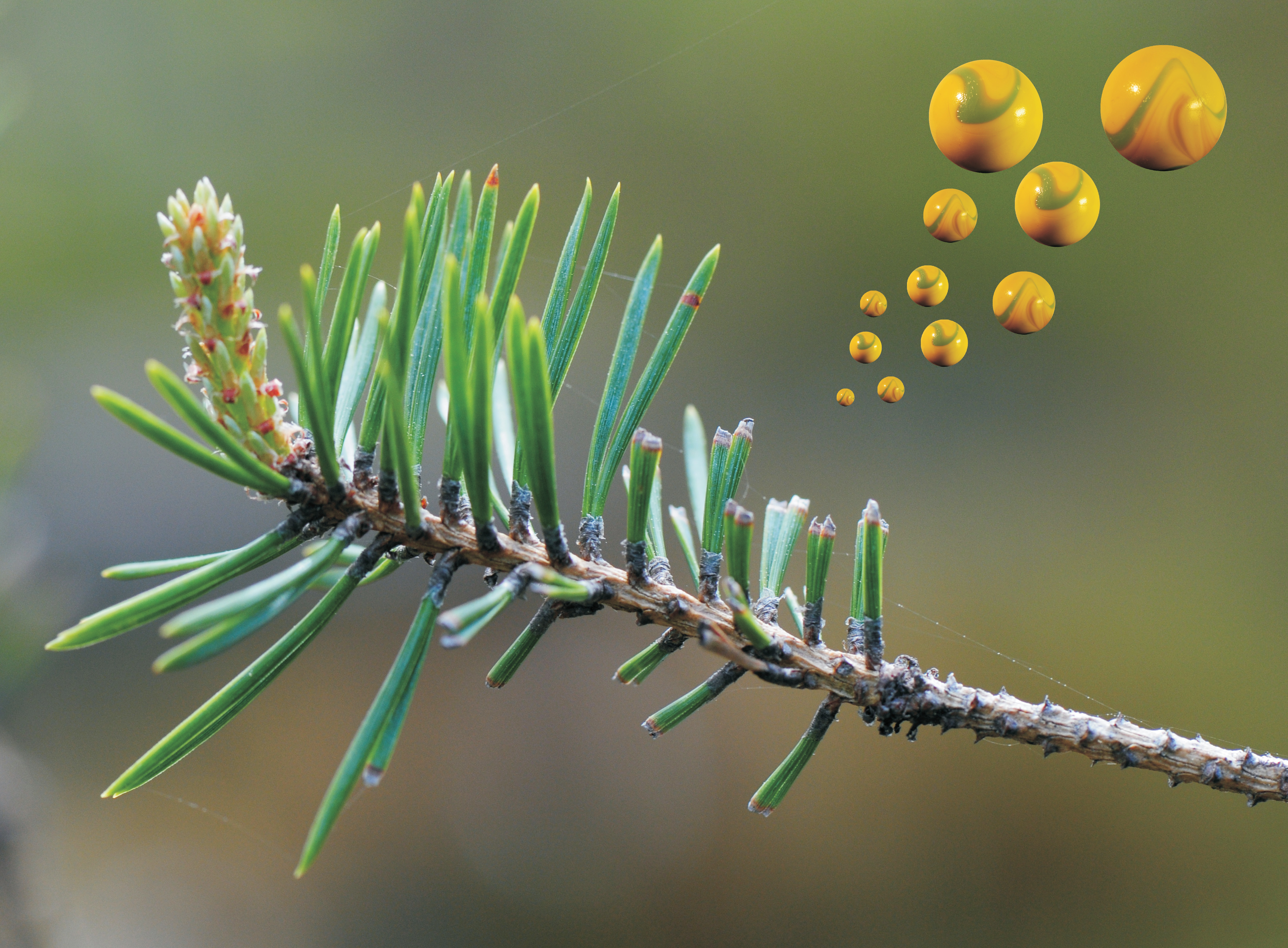 Many boreal tree species like this pine emit precursor gases that then go on to form secondary organic aerosol particles in the atmosphere. Contrary to previous assumptions, these are not liquid but as hard as little glass marbles. (Photo: Thomas Koop and Jarmo Holopainen)
