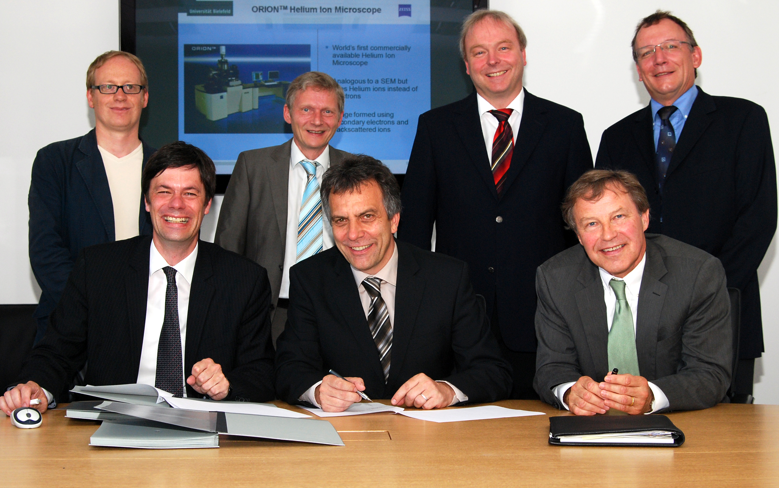 Memorandum of Understanding“: Dr. Frank Stietz, Rektor Prof. Dr.-Ing. Gerhard Sagerer, Kanzler Hans-Jürgen Simm (vorn v.l.) und die Physiker Dekan Prof. Dr. Dominik Schwarz, Prof. Dr. Günter Reis, Prof. Dr. Armin Gölzhäuser sowie Dr. Klaus Edinger (v.l.)