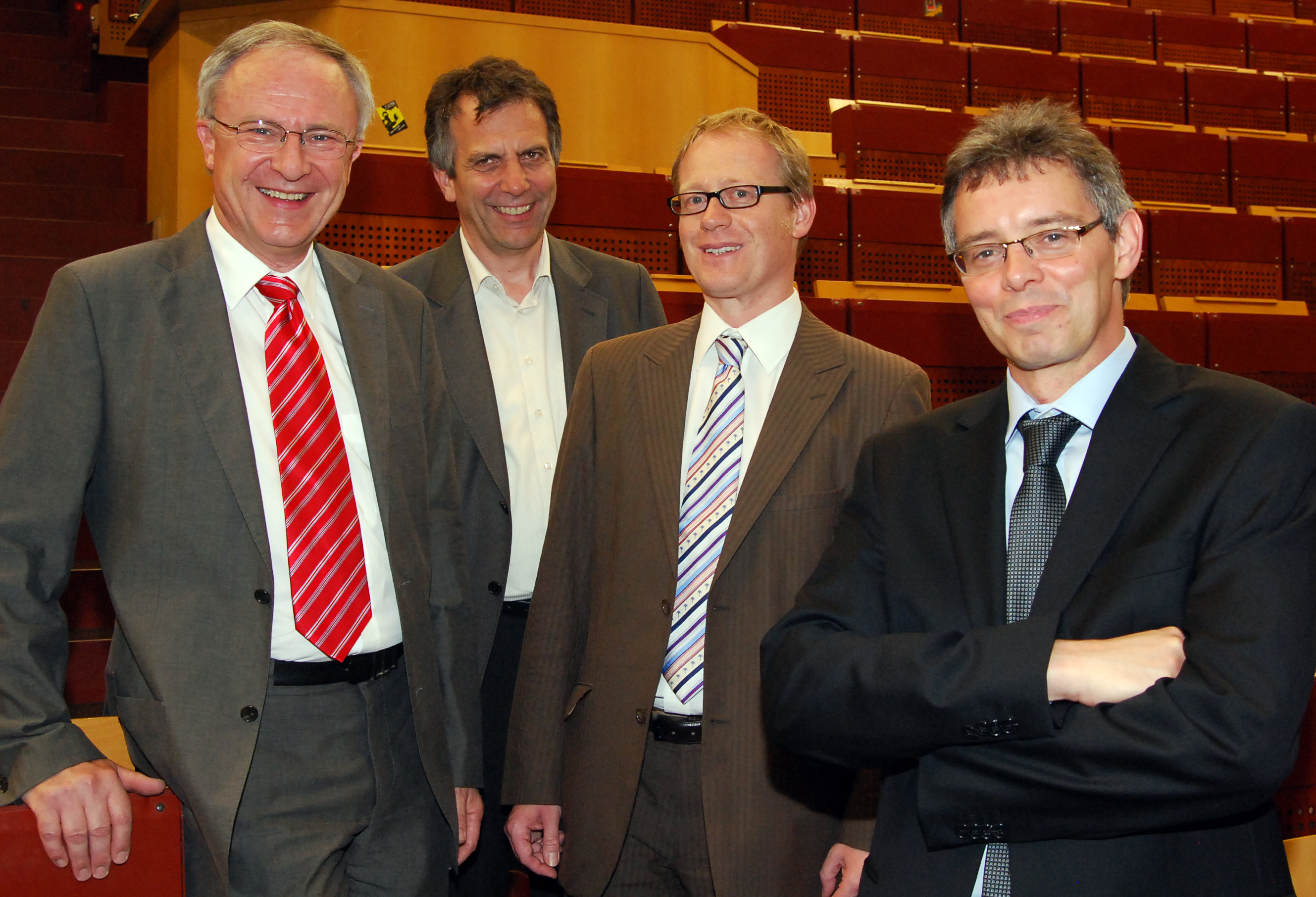 v. links:Prof. Dr. Ulrich Heinzmann (Fakultät für Physik), Professor Dr.-Ing. Gerhard Sagerer (Rektor Universität Bielefeld), Professor Dr. Dominik Schwarz (Dekan der Fakultät für Physik) und Honorarprofessor Dr. Helmut Stiebig.