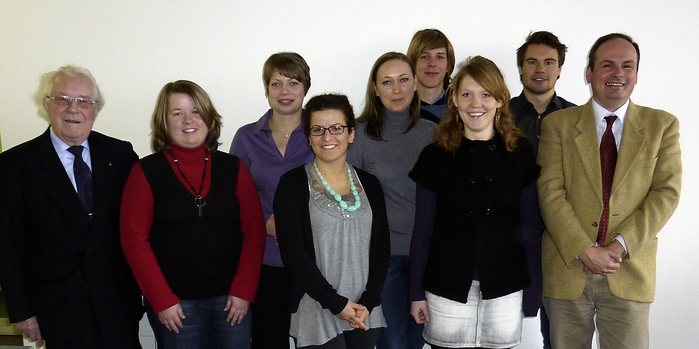 Professor Dr. Helmut Steiner mit den Stipendiaten Kathrin Stapel, Rabea Sutter, Nermin Gör-gin, Helene Eschenbrenner, Hendrik Konietzny, Anna Herbst und Sebastian Köhne sowie Dr. Thomas Lüttenberg vom International Office (v.l.).