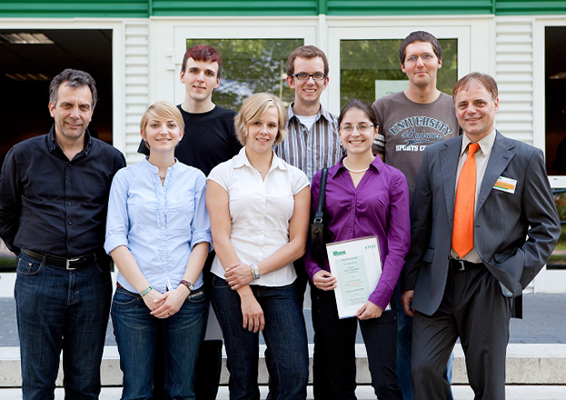 Prof. Dr. Gerhard Sagerer (Co-Koordinator CITEC), Carina Fürst, Richard Schroeder, Eva-Maria Reuter, Torben Töniges, Rebecca Bröhl, Michael Horst und Prof. Dr. Thomas Schack (Leiter der Graduate School Cognitive Interaction Technology) (v.l.)
