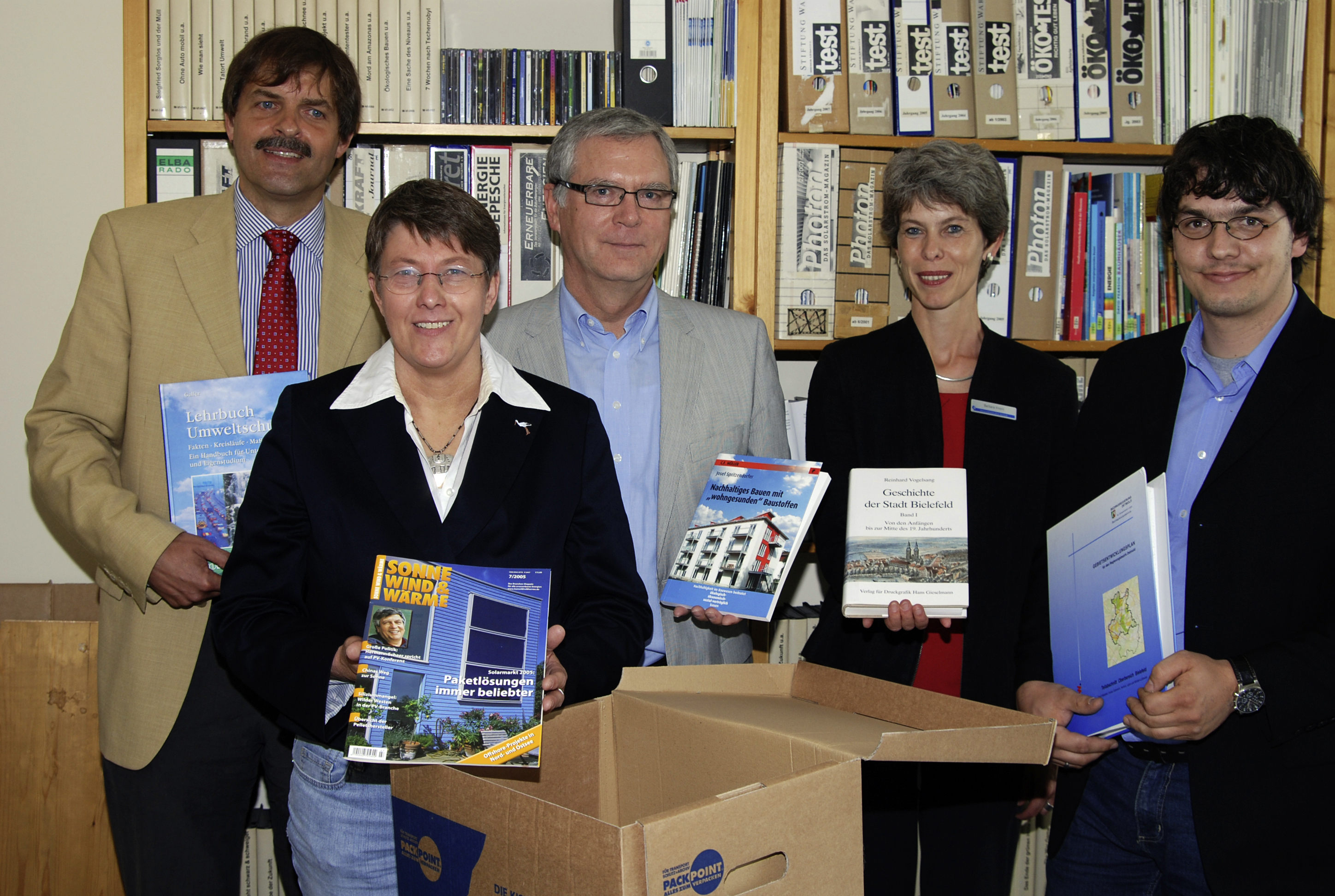 Prof. Dr. Michael Kotulla, Dorothea Schwartze (Umweltzentrum), Dr. Michael Höppner, Barbara Knorn und André Erpenbach (v.l.) freuen sich über die gelunge Bücherübergabe.