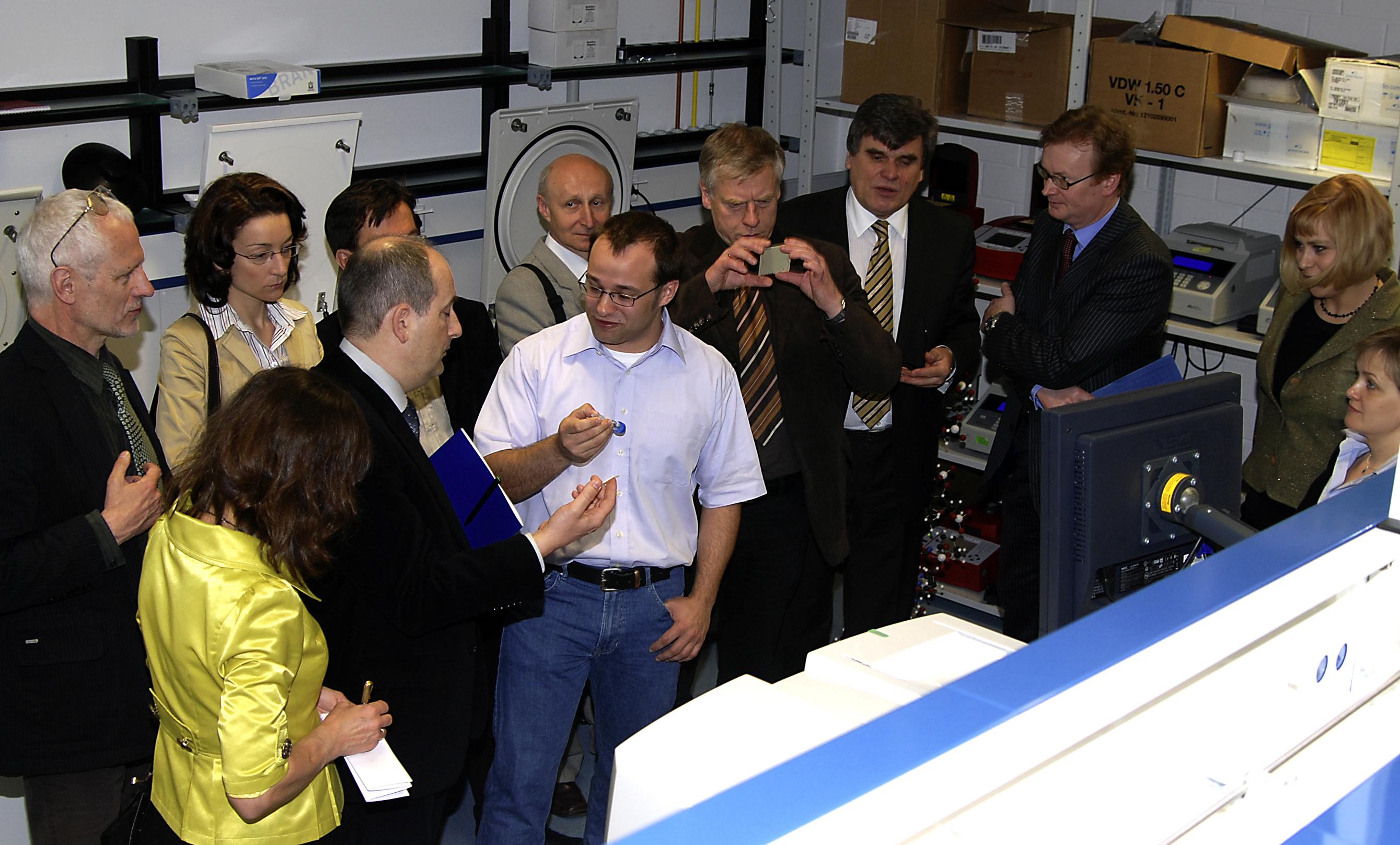 Die polnische Delegation im CeBiTec. Im Hintergrund prüft der Vizerektor der Universität Rzeszów, Prof. Aleksander Bobko, ein Probe. Der stellvertretende Stadtpräsident von Rzeszów, Henryk Wolicki, und der Bielefelder Prorektor für Studium und Lehre, Prof. Johannes Hellermann (beide rechts von Bobko), schauen ihm dabei dabei zu."