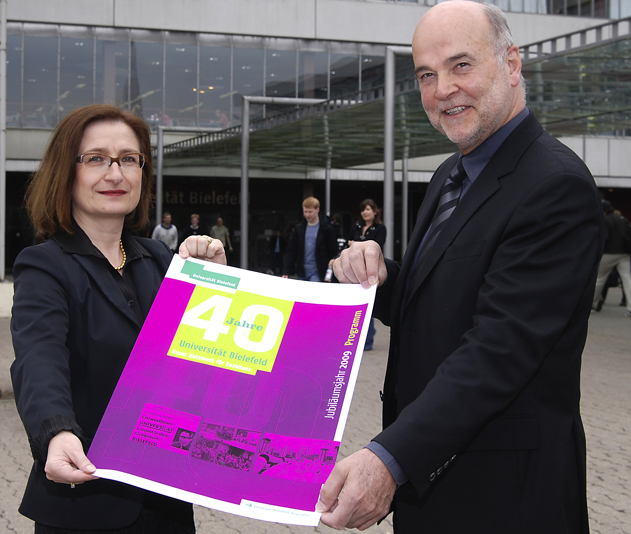 Bild: Prorektorin Joanna Pfaff-Czarnecka und Rektor Dieter Timmermann präsentieren das Plakat zum UniversitätsjubiläumBildnummer: 57359