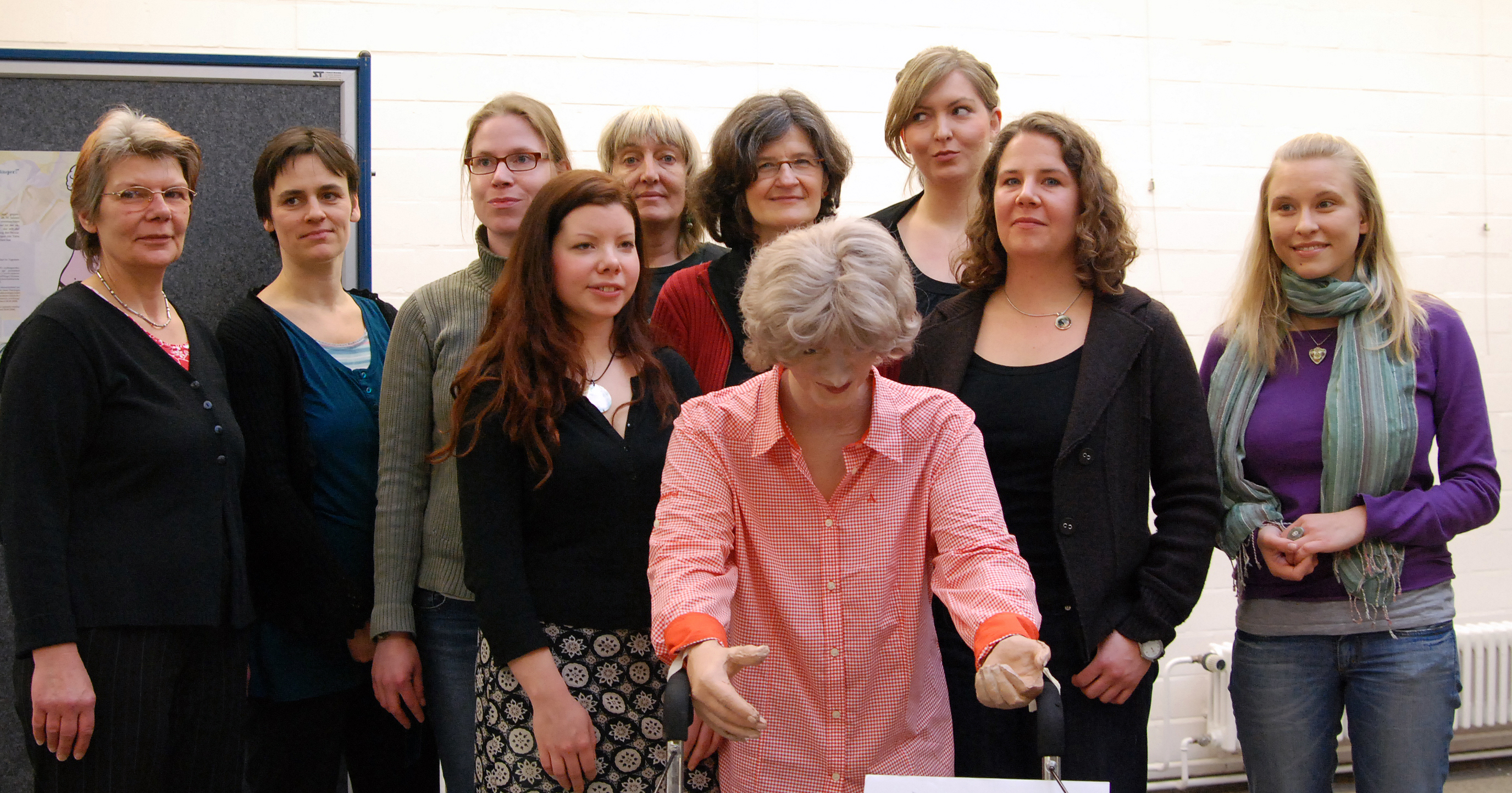 v. links: Veronika Schmidt-Lentzen (stellvertretende Gleichstellungsbeauftragte), Uschi Baaken (Gleichstellungsbeauftragte), Nicole M. Wilk (Referentin), Hanna Danze, Jutta Grau (Mitarbeiterin Gleichstellungsbeauftragte), Cornelia Neumann (Psychologische Frauenberatung), Mona Gröning (Psychologische Frauenberatung), Sylvia Krenzel (Psychologische Frauenberatung), Helen Dietz (Psychologische Frauenberatung). Mitte: eine Schaufensterfigur der Ausstellung